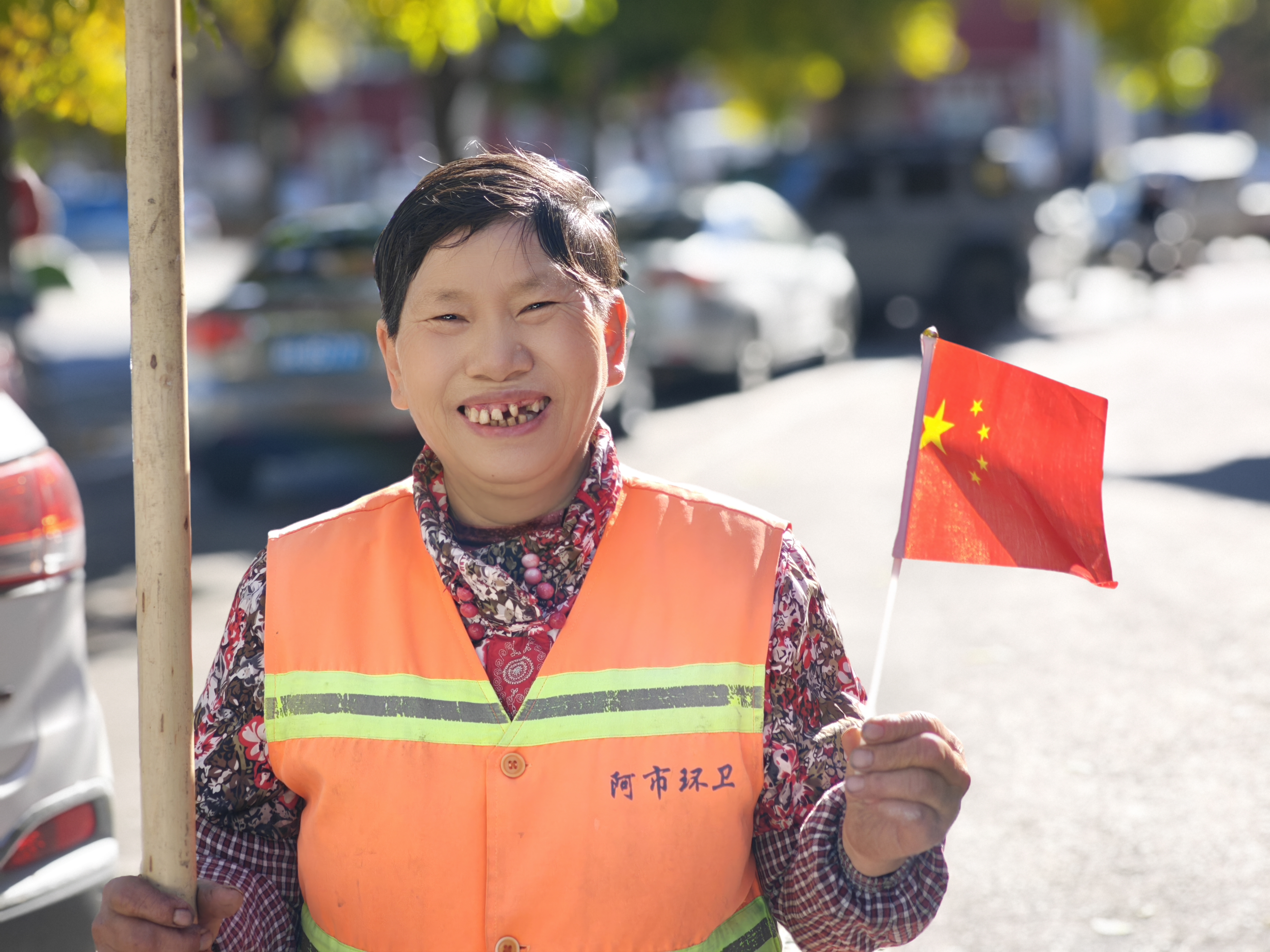 阿勒泰市环卫工人窦改枝:“祝愿祖国欣欣向荣,人民幸福安康!”记者 王子源 摄