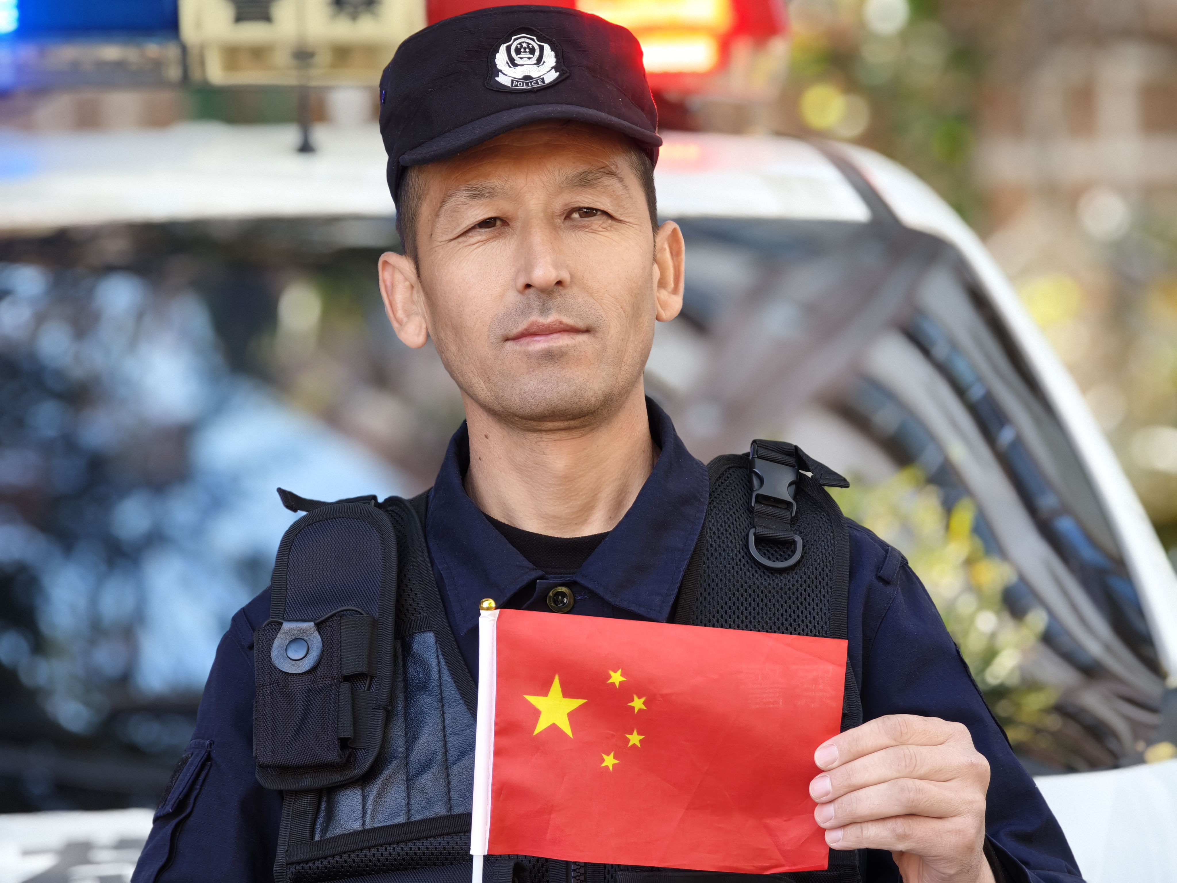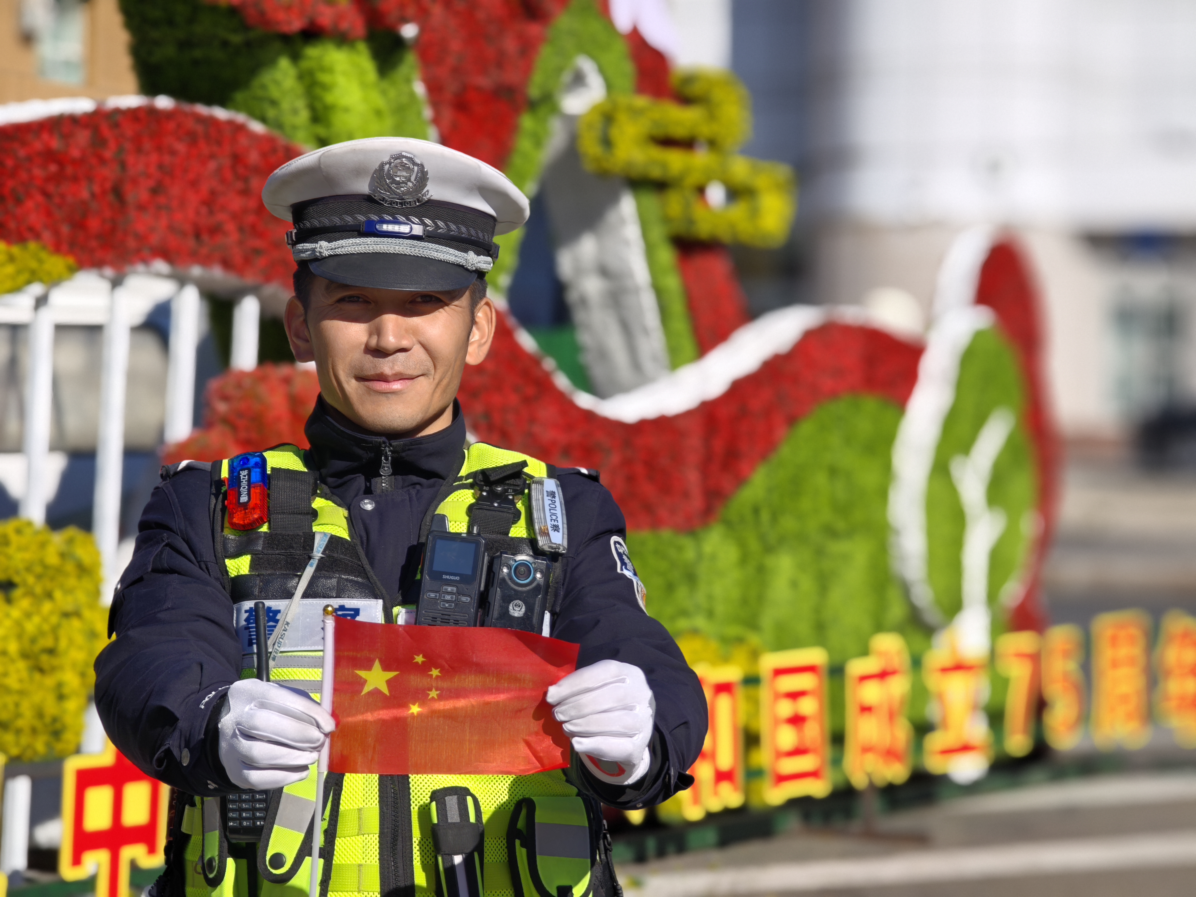 阿勒泰市交警大队秩序中队辅警达吾然·米拉提汗:“祝愿祖国明天更美好!”记者 王子源 摄