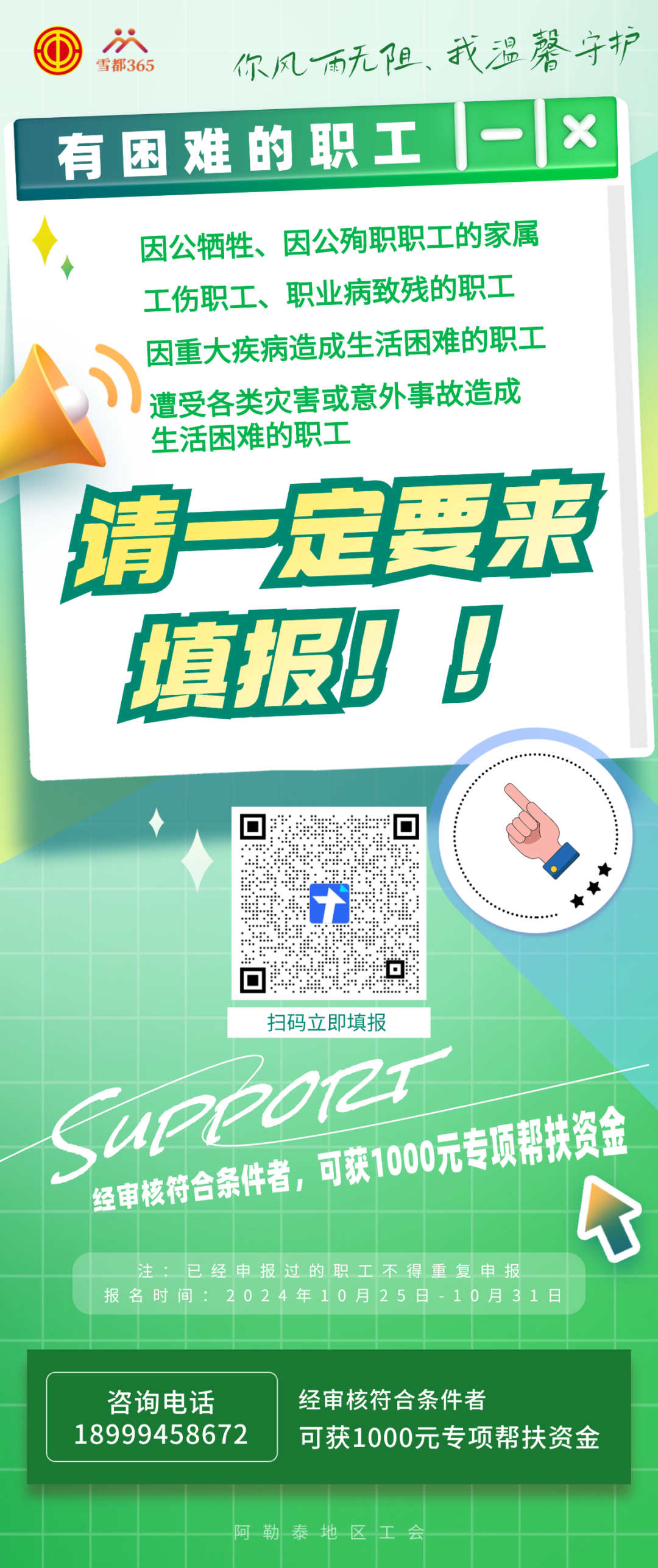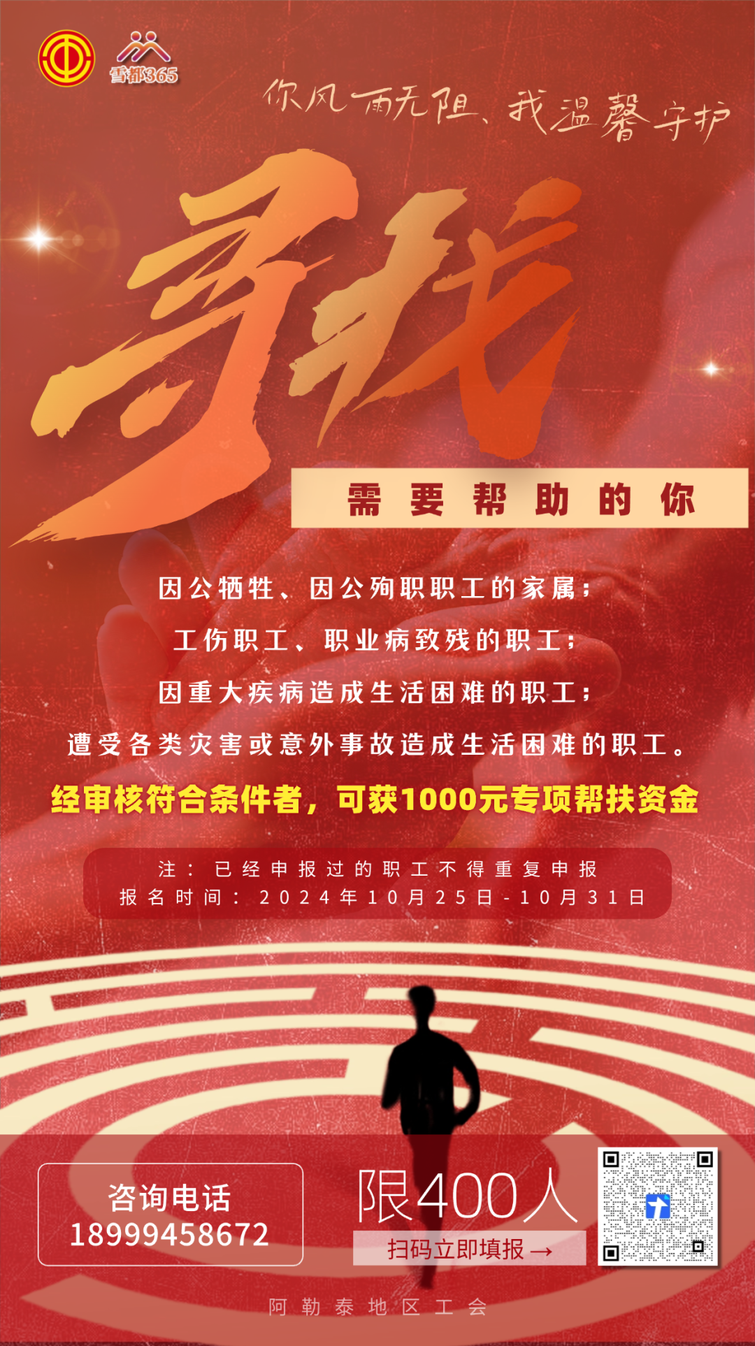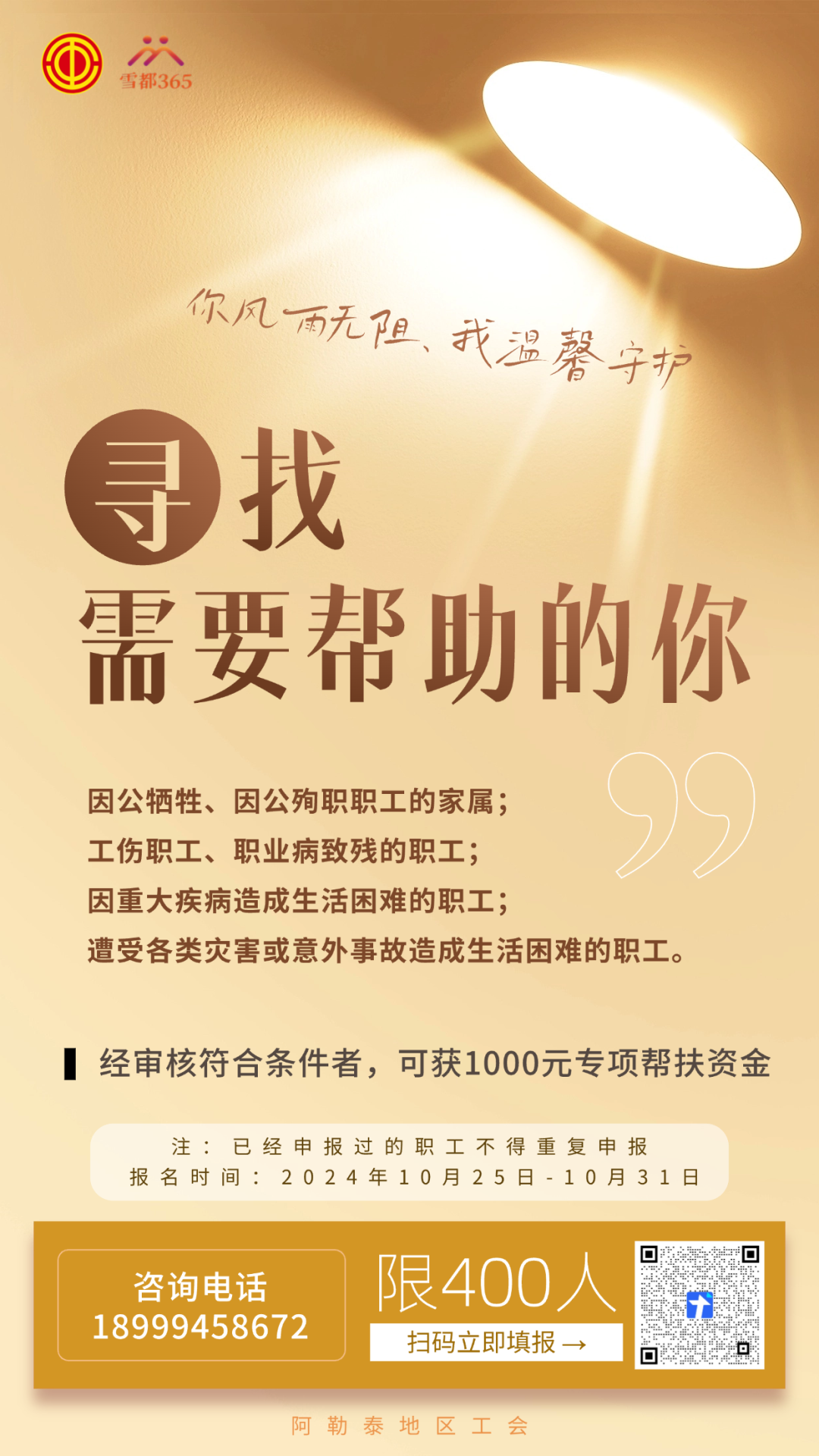 阿勒泰新闻网-阿勒泰地区融媒体中心(记者 古丽娜)10月27日,记者从地区工会获悉,为进一步做好对困难职工群体的帮助,10月25日起地区工会启动“2024年面向困难职工群体送温暖和帮扶服务”信息登记统计工作,凡符合条件者可于2024年10月31日前提交申请,经审核通过后,可获得1000元专项帮扶资金。