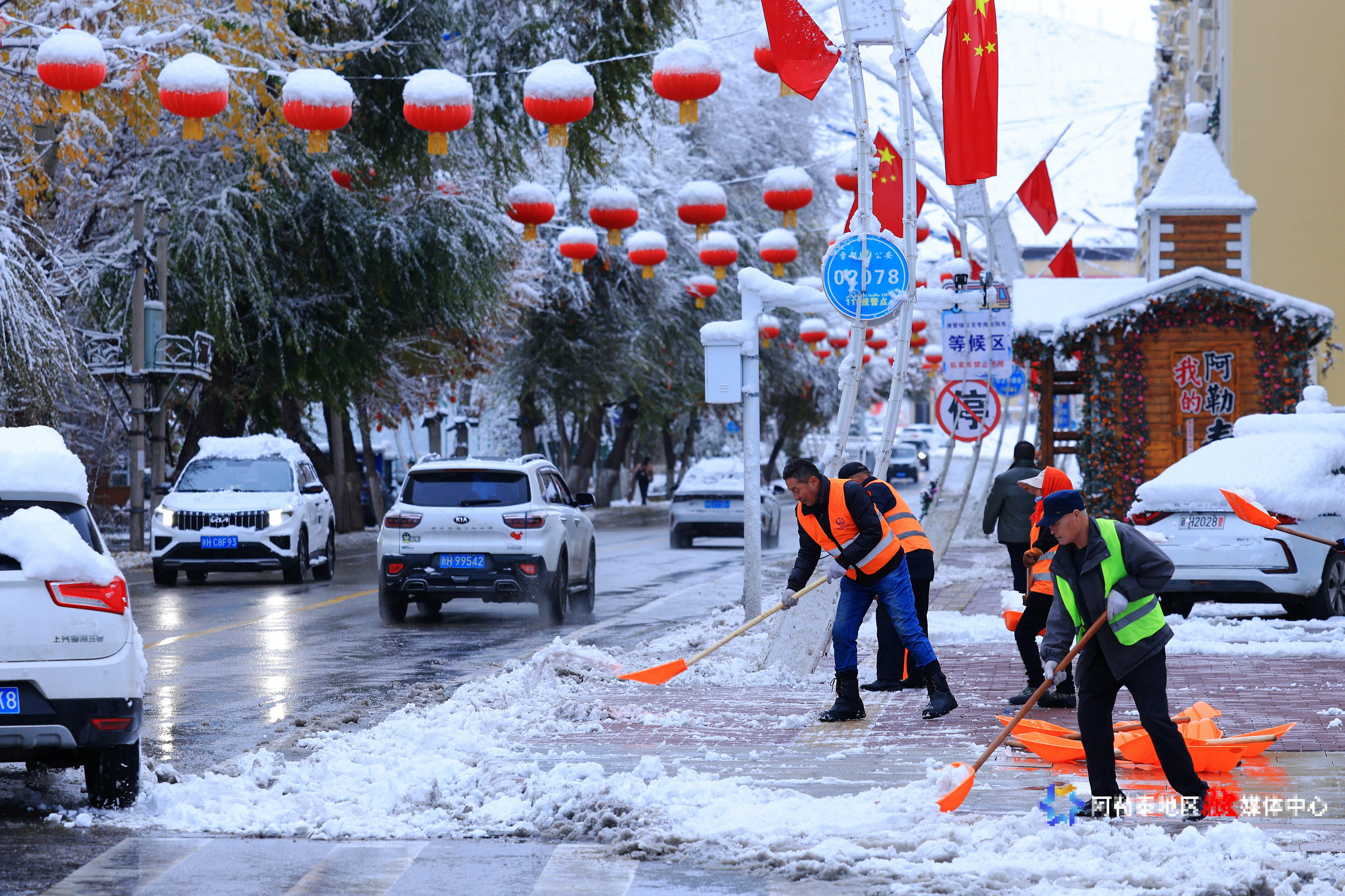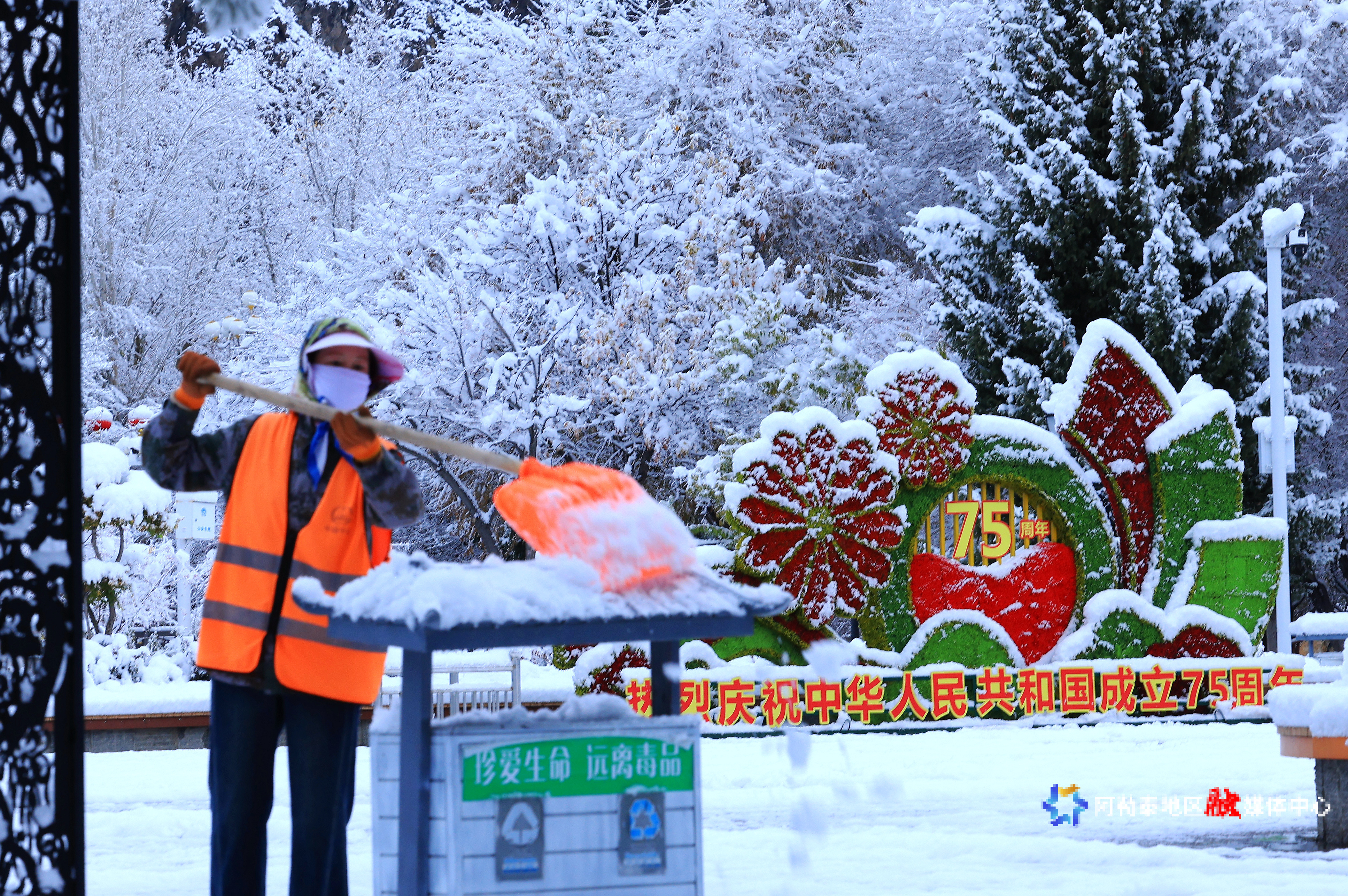 10月30日,环卫工人在阿勒泰市街道清理积雪。阿尔达克·拜斯汗 摄