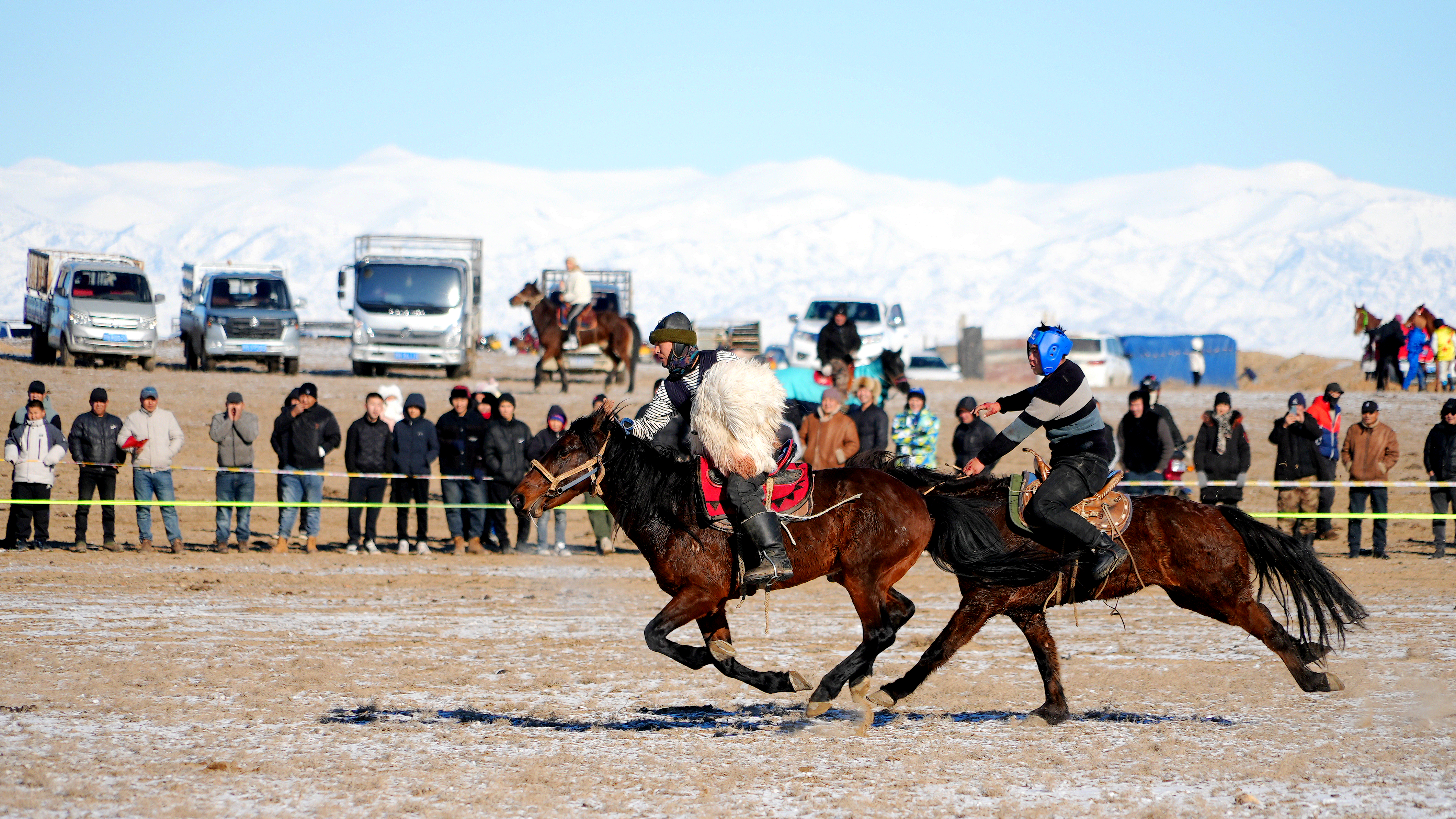 在赛马现场,骏马在骑手的驾驭下如同离弦之箭,展现出马背上的“速度与激情”,观众的呐喊助威声此伏彼起。在刁羊比赛中,两队人马策马扬鞭,在雪地上来回穿梭,赛骑术、比力气、拼智慧,场面惊心动魄,点燃了“冬天里的一把火”。