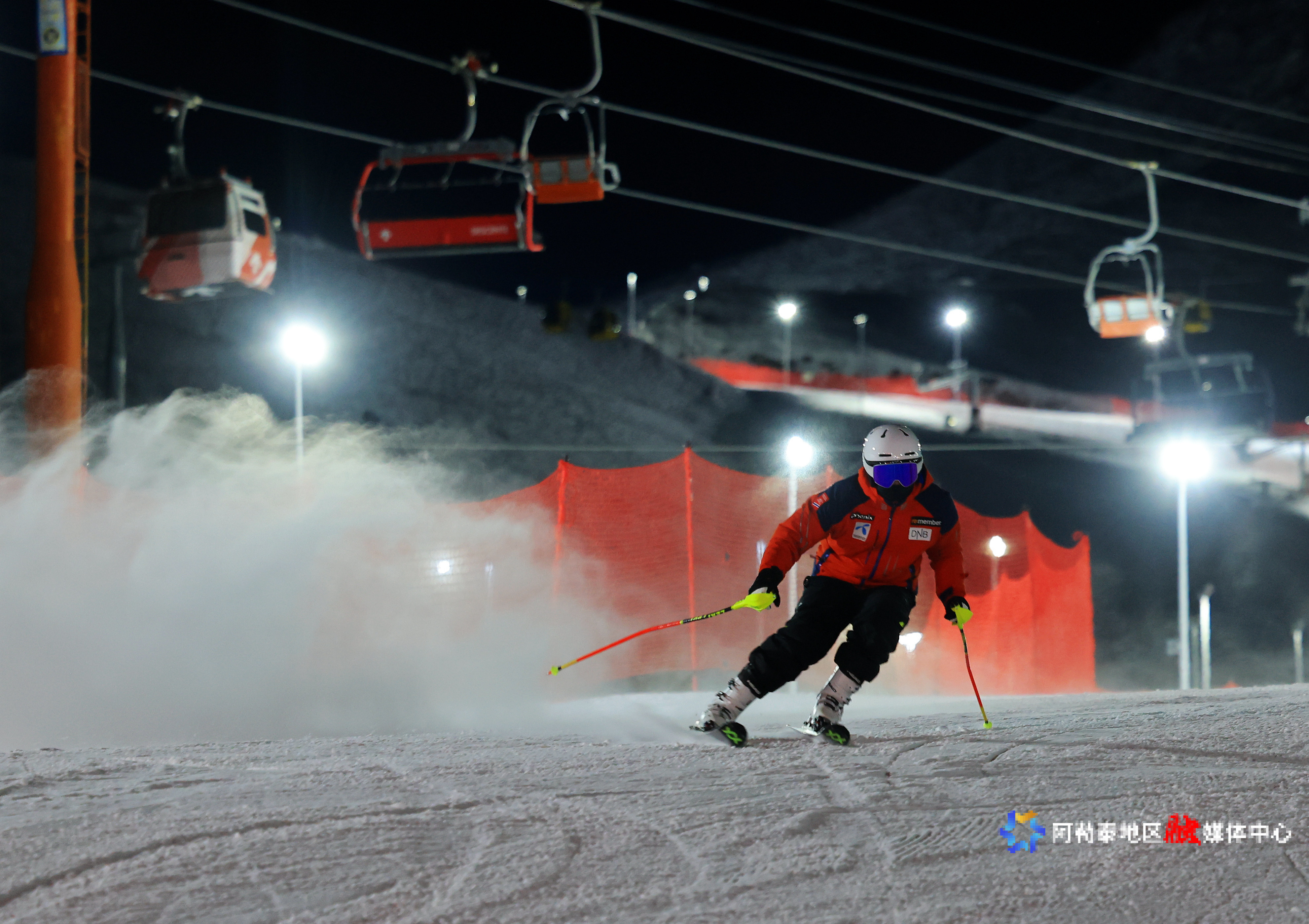 11月19日晚,阿勒泰市将军山国际滑雪度假区各地游客及滑雪爱好者体验夜间滑雪乐趣。 阿尔达克·拜斯汗 摄