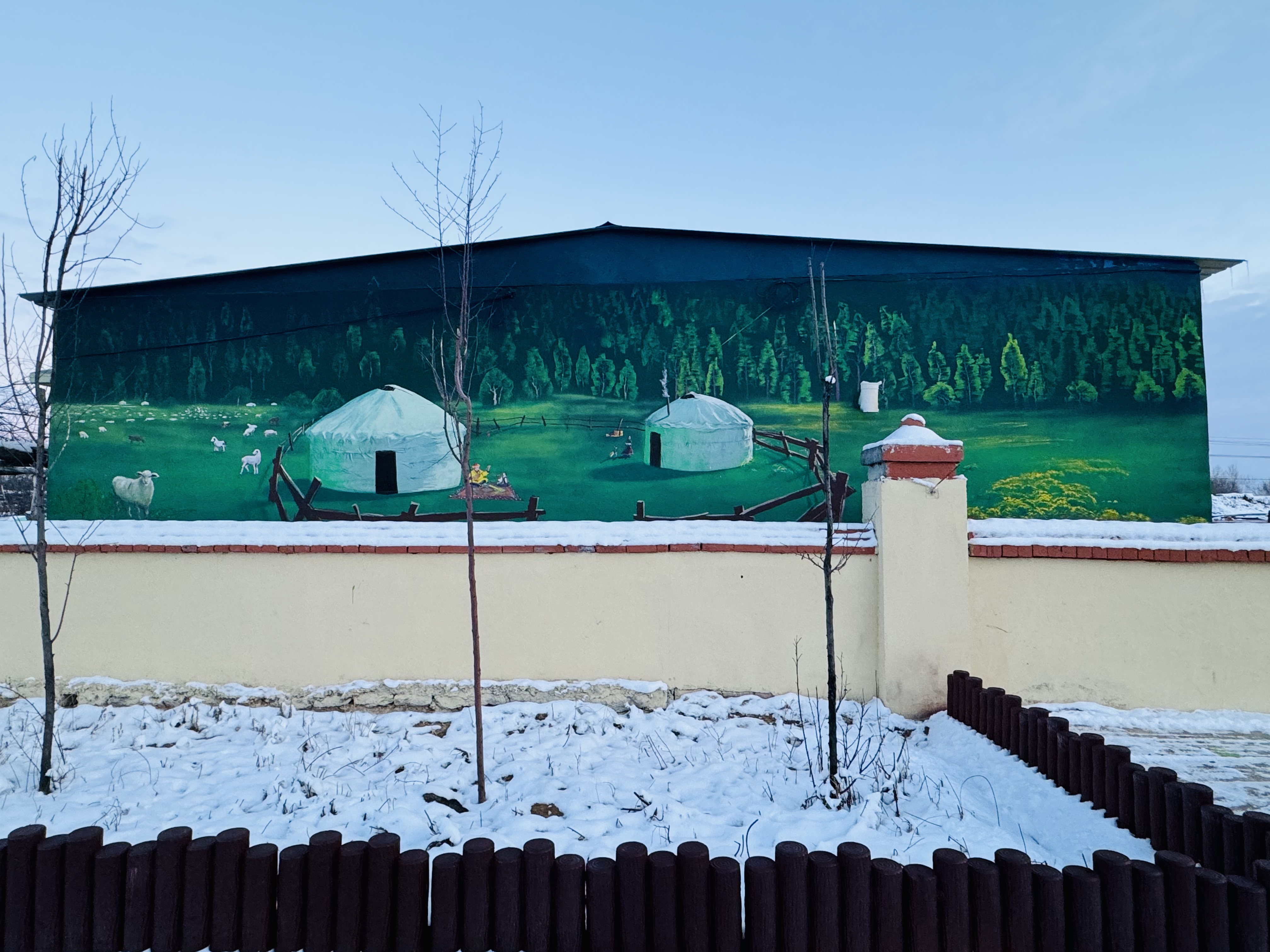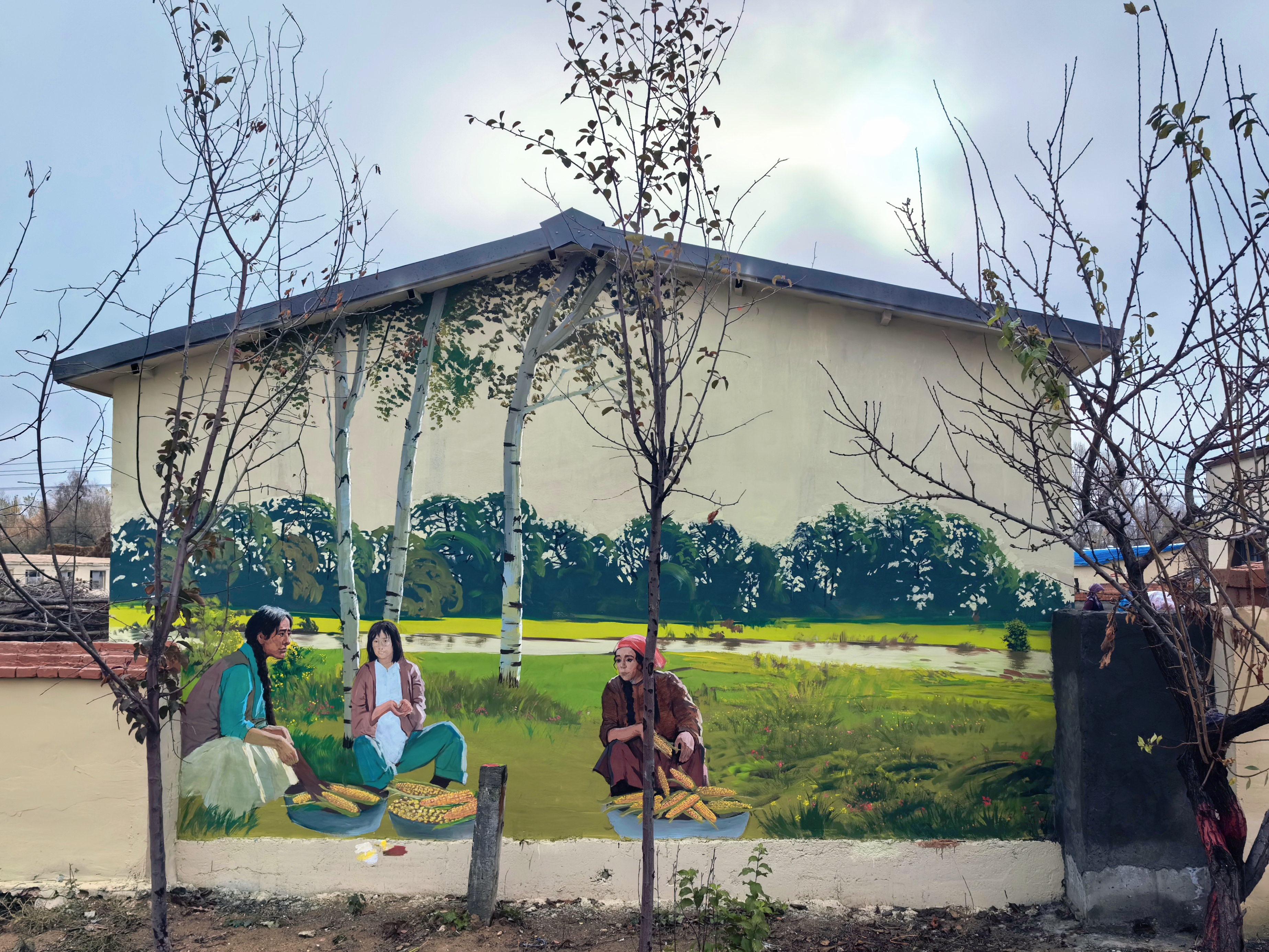 在库勒拜镇萨尔塔克太村,一面面墙壁焕然一新。墙面上,文秀与巴太偶遇的温馨场景、湛蓝的天空、广袤的草原以及身着传统服饰的牧民,都被巧妙融入一幅幅色彩绚丽的墙绘之中。
