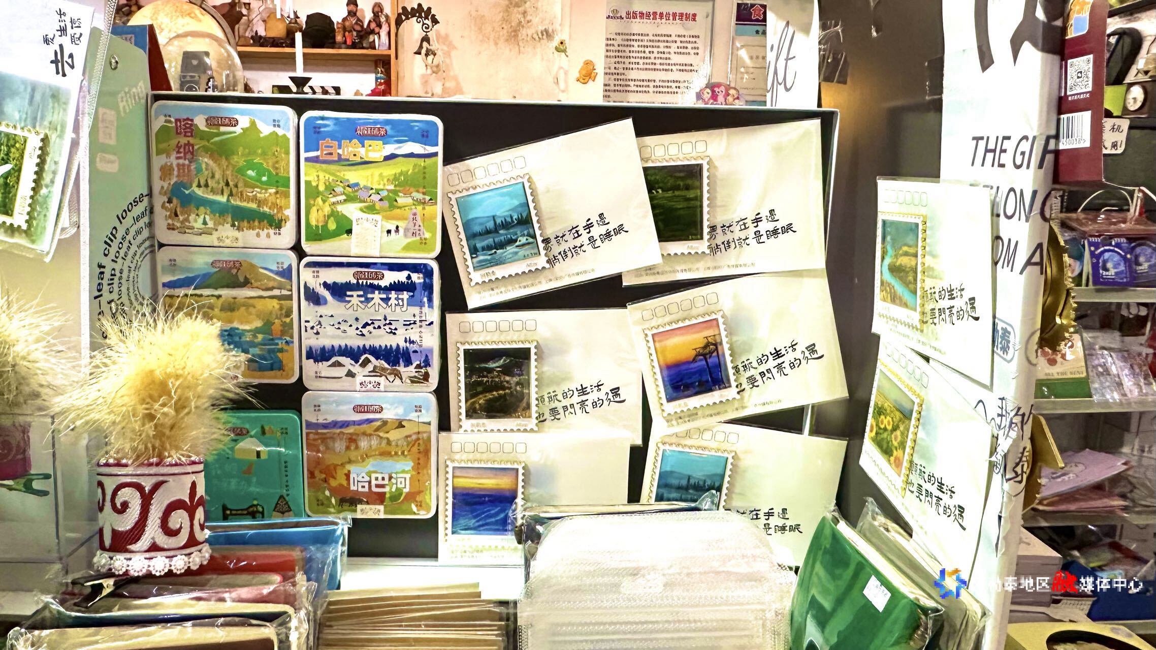 在中国邮政集团有限公司阿勒泰地区分公司五百里主题邮局,游客们正有序排队等候,为刚刚购买的明信片加盖带有阿勒泰元素的印章。该邮局设有一方印章台,陈列的印章品类极为丰富,图案均取自阿勒泰的独特风貌。