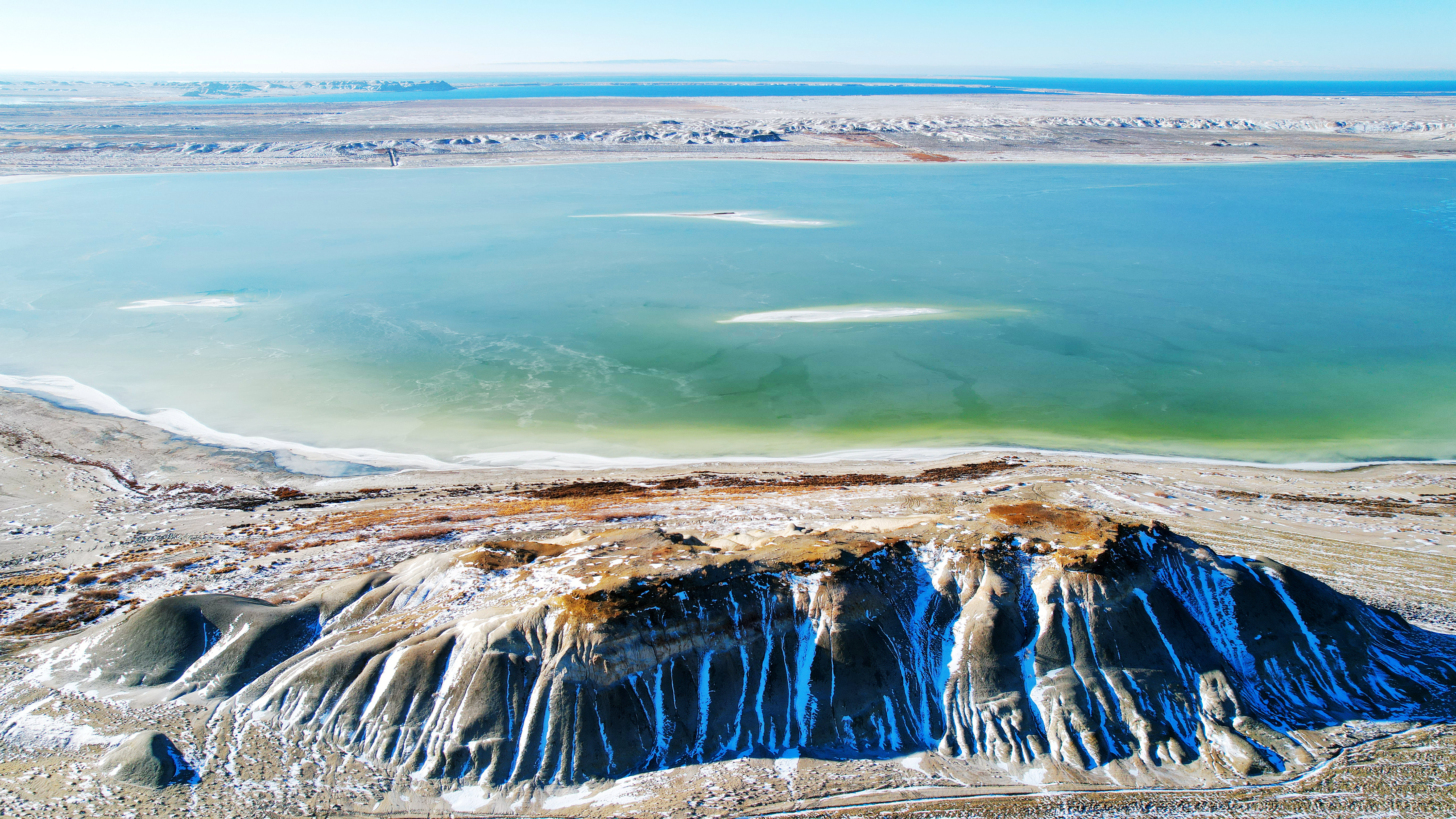 近日,福海县降下入冬后的第一场雪,洁白的雪花覆盖在湖边的雅丹地貌之上,与湖水形成一幅幅绝美的画卷。