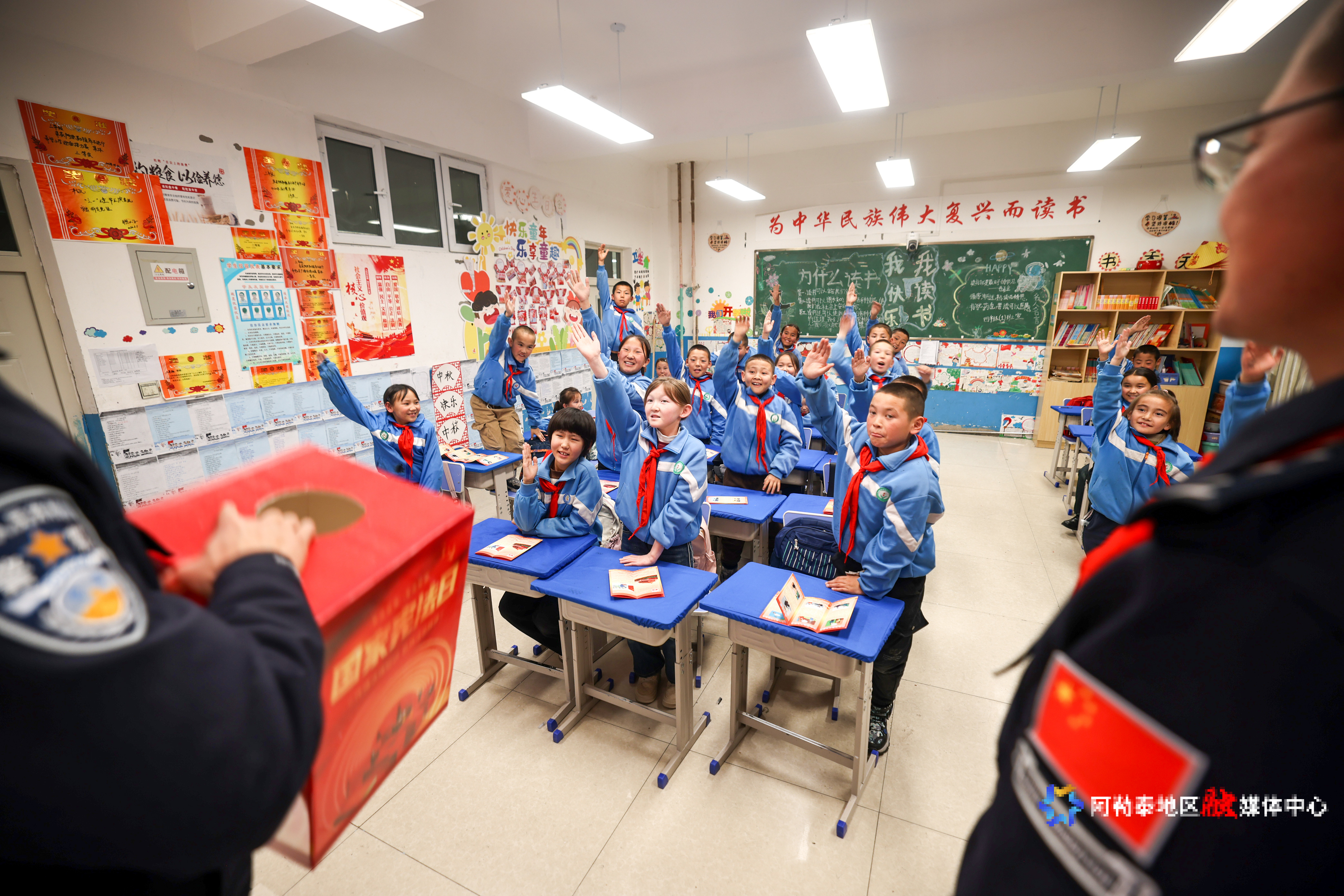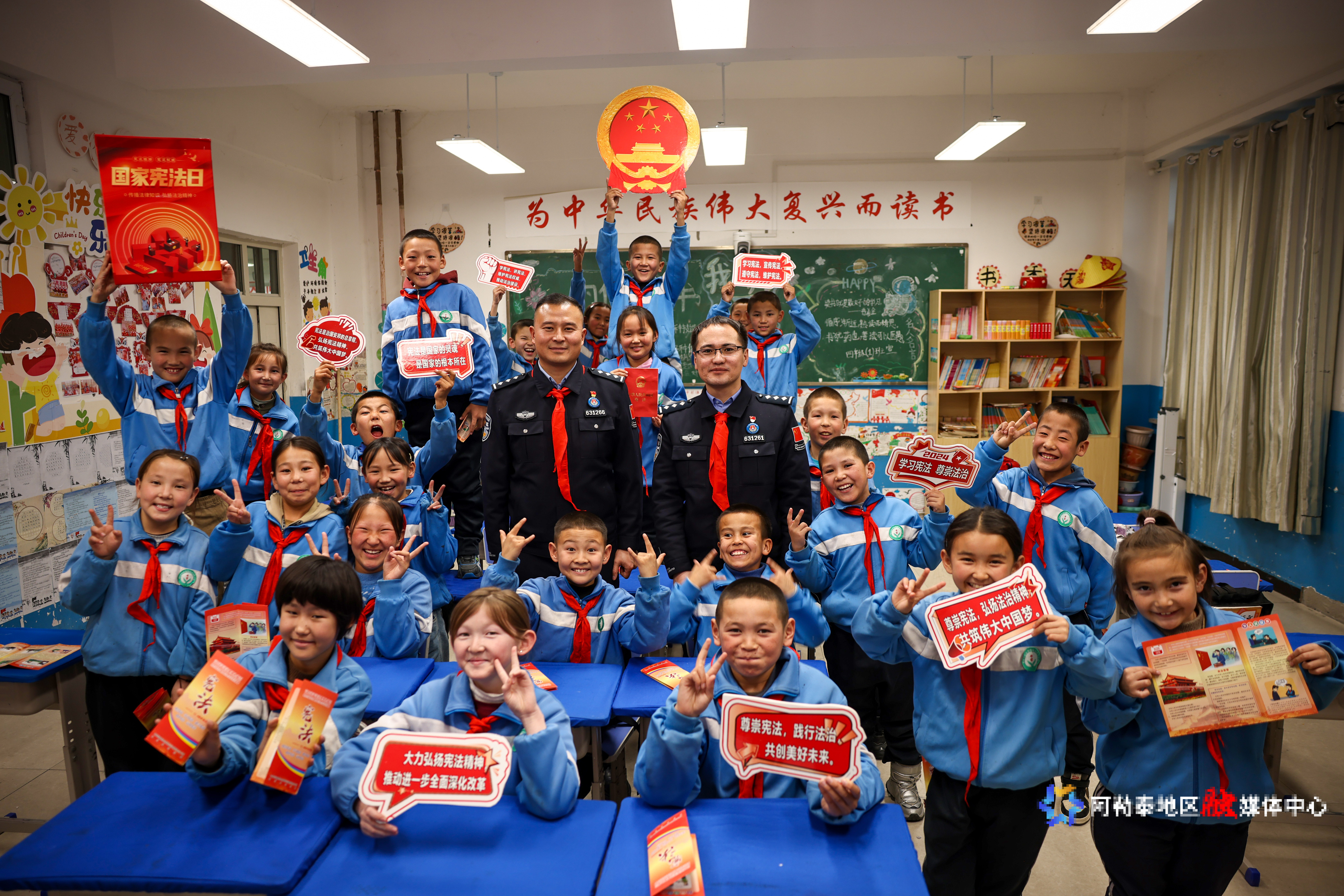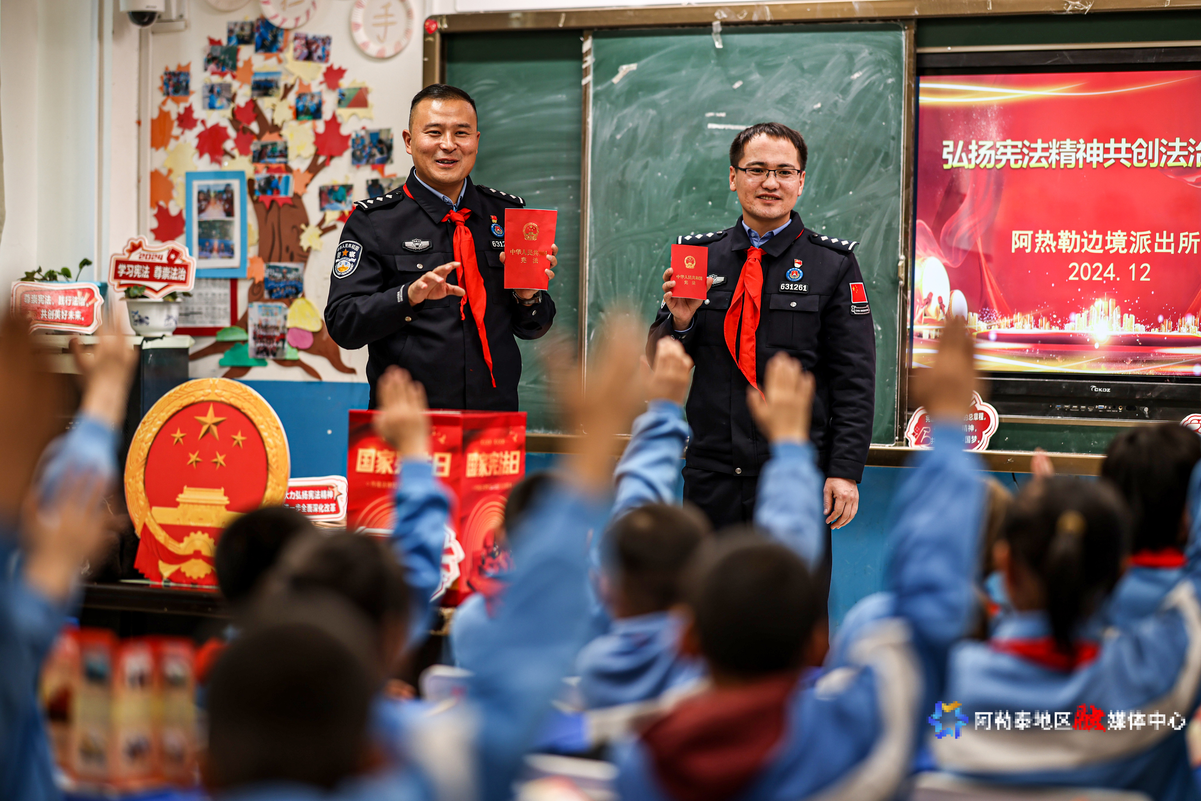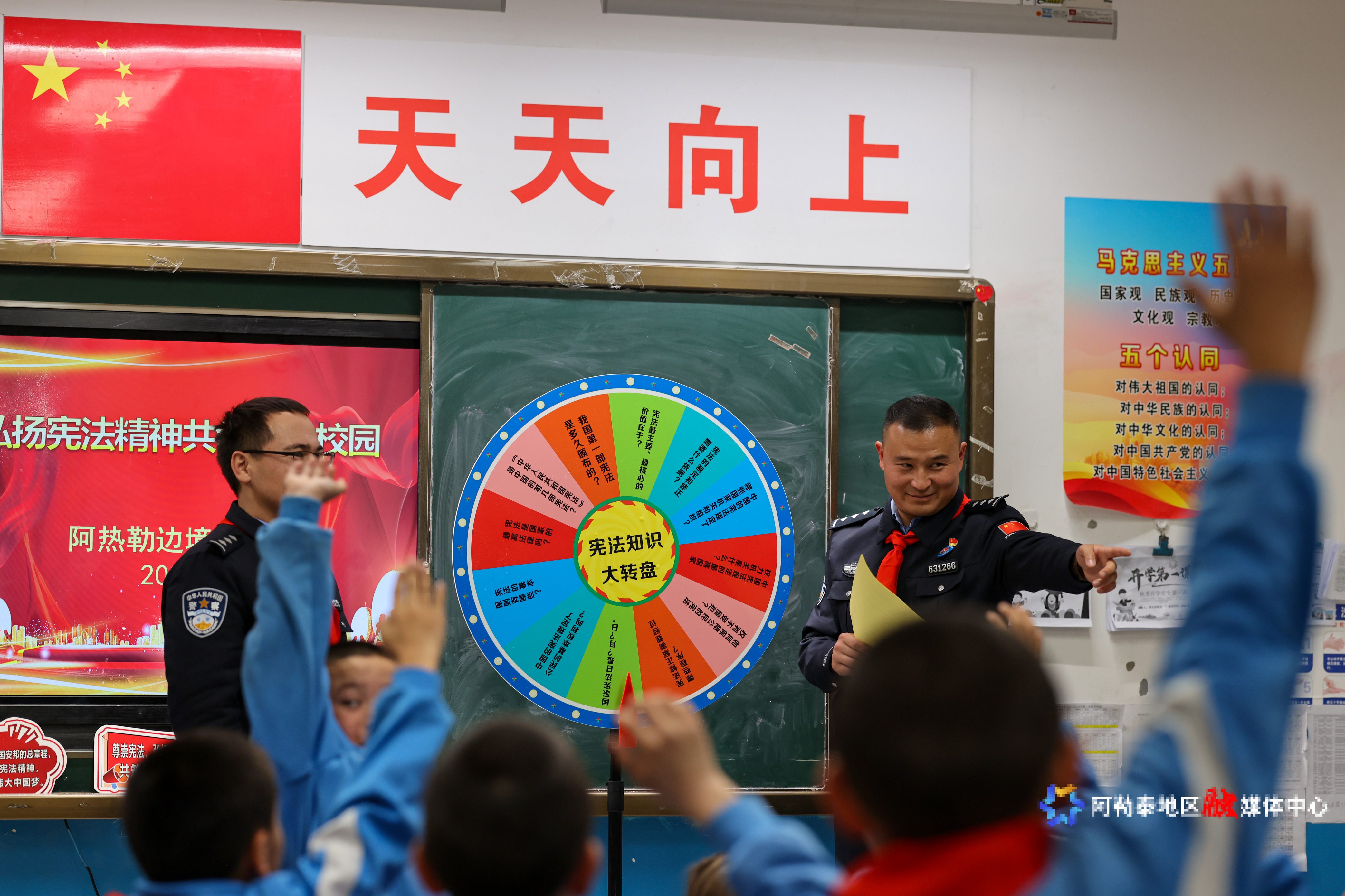 阿勒泰新闻网-阿勒泰地区融媒体中心(特约记者 王友波 通讯员 何乐为) 12月3日,阿勒泰边境管理支队青河边境管理大队阿热勒边境派出所民警走进辖区阿热勒镇福和希望小学,开展宪法主题教育宣传进校园活动。民警通过赠送宪法读本、盲盒抽“奖”、转盘学法、互动问答等方式,向师生们普及宪法知识,弘扬宪法精神。
