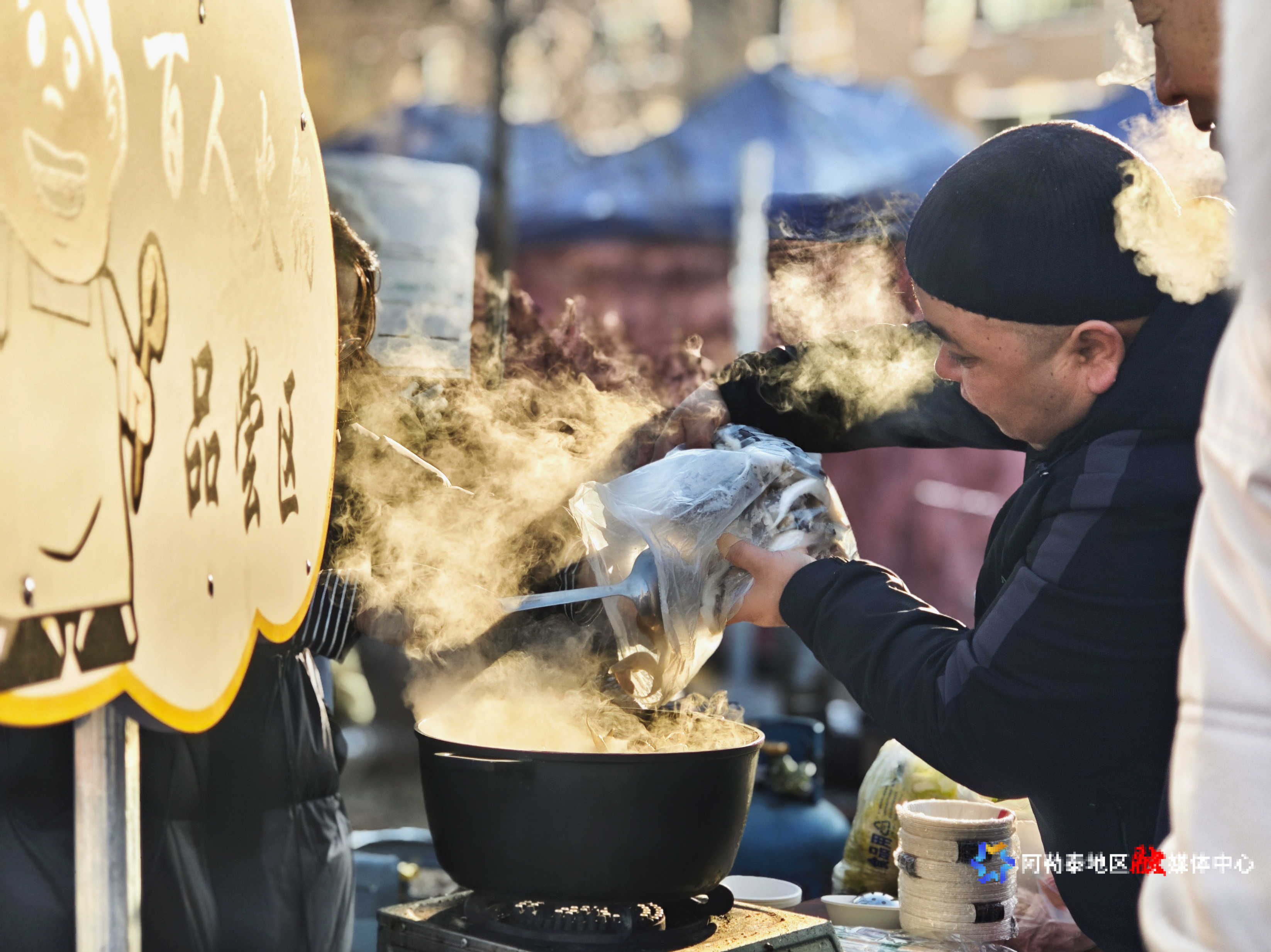 在阿勒泰市红墩镇,每逢赶集日,新鲜的牛羊肉、香气四溢的羊杂汤、晶莹剔透的冰糖葫芦、刚出锅的包子……这些美食与此伏彼起的吆喝声、讨价还价声交织在一起,构成了大集独有的热闹景象。人们对烟火气的追随是一种天性,而大集是最能提供这种气息的代表性场所。