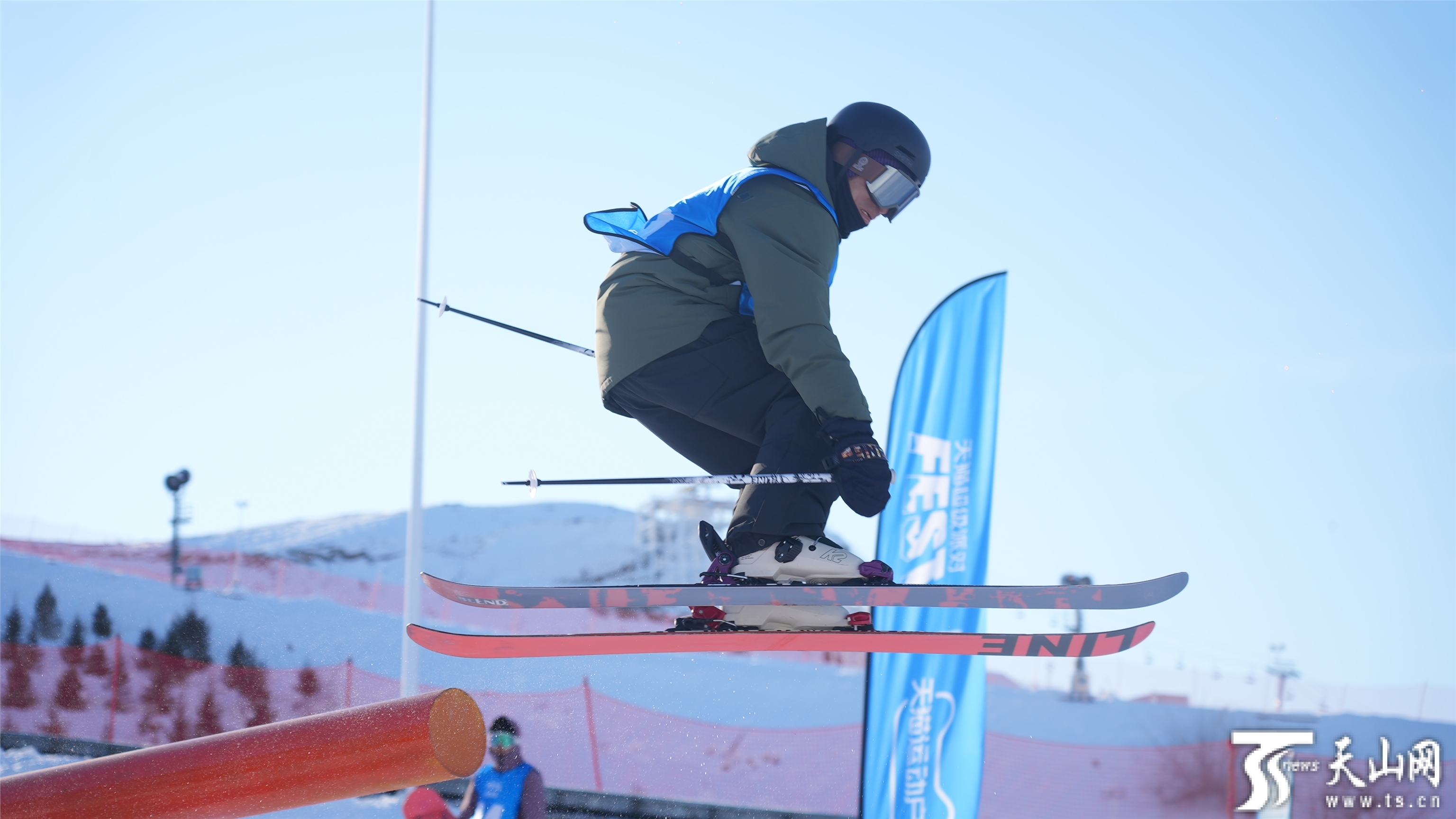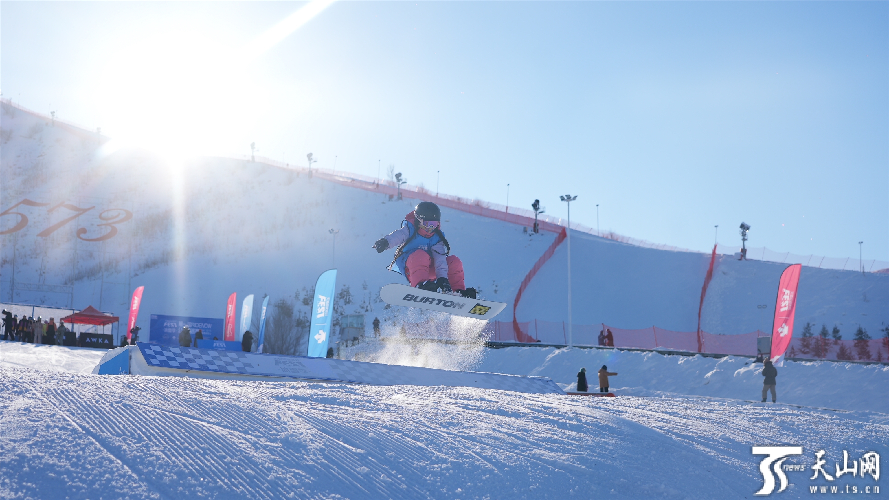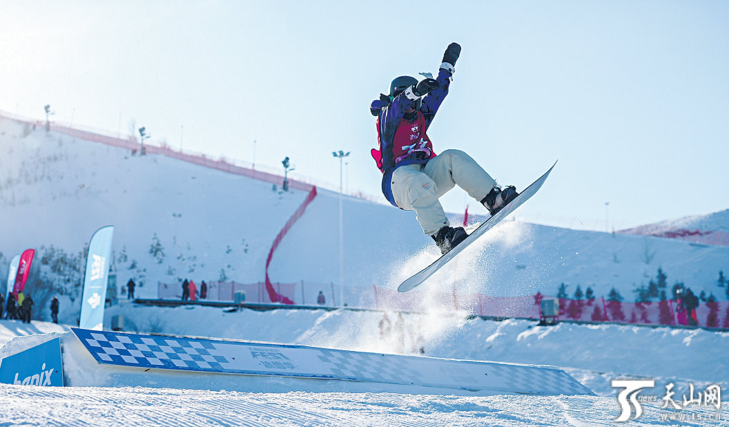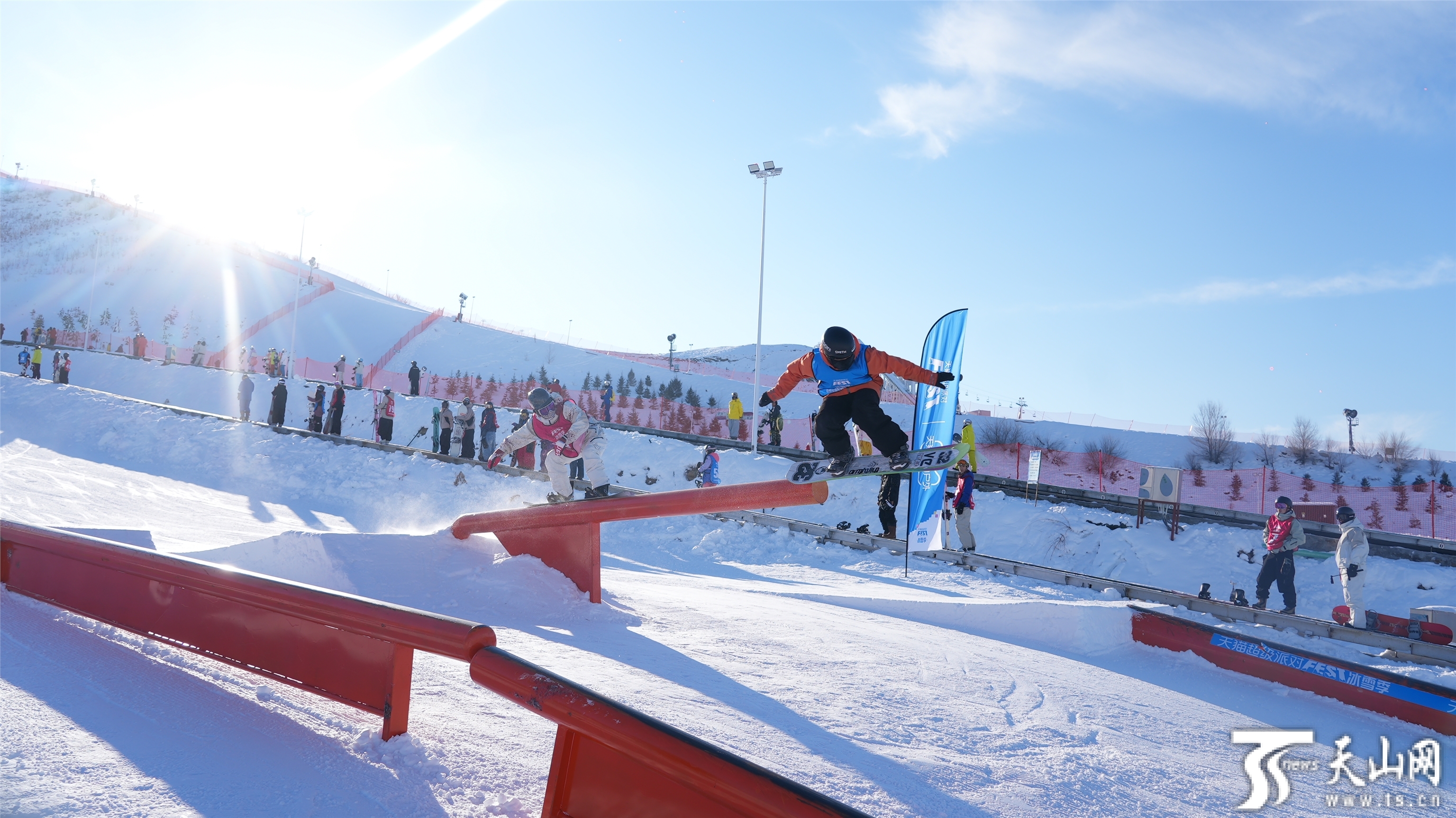 12月15日,选手在“RIDENOW公园果酱赛”上激情献技。当日,第一届天猫冰雪季“RIDENOW公园果酱赛”在阿勒泰市将军山国际滑雪度假区开赛。库奋·尼格买提摄