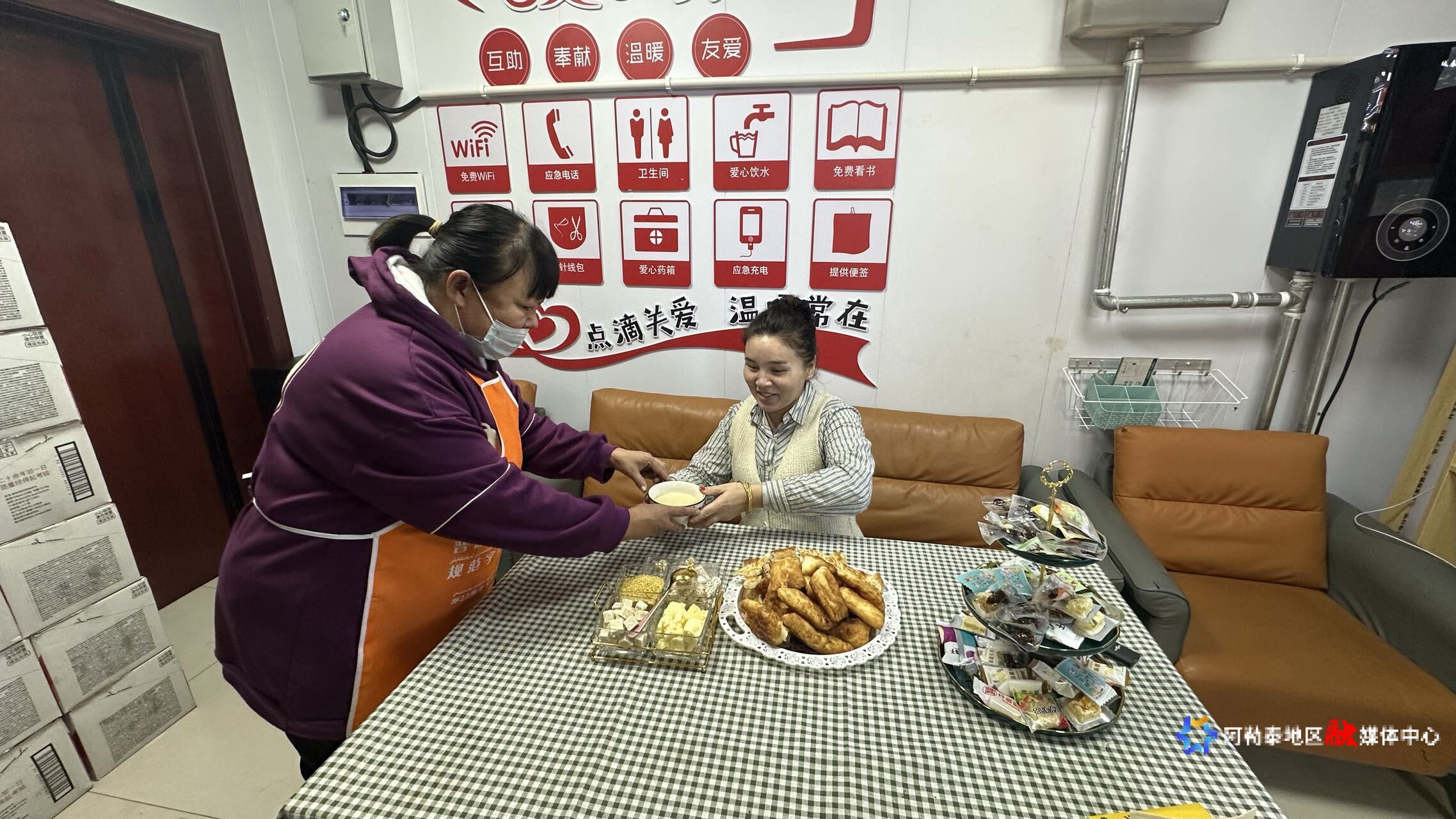 巴里巴盖乡日照金山服务站不仅提供了便捷的烹饪设施,还在厨房外设置了舒适的就餐区,供人们享用美食。更为贴心的是,服务站还免费提供了奶酪、油馕、塔尔米等本地特色食品,让游客和居民能够品尝到地道的阿勒泰风味。