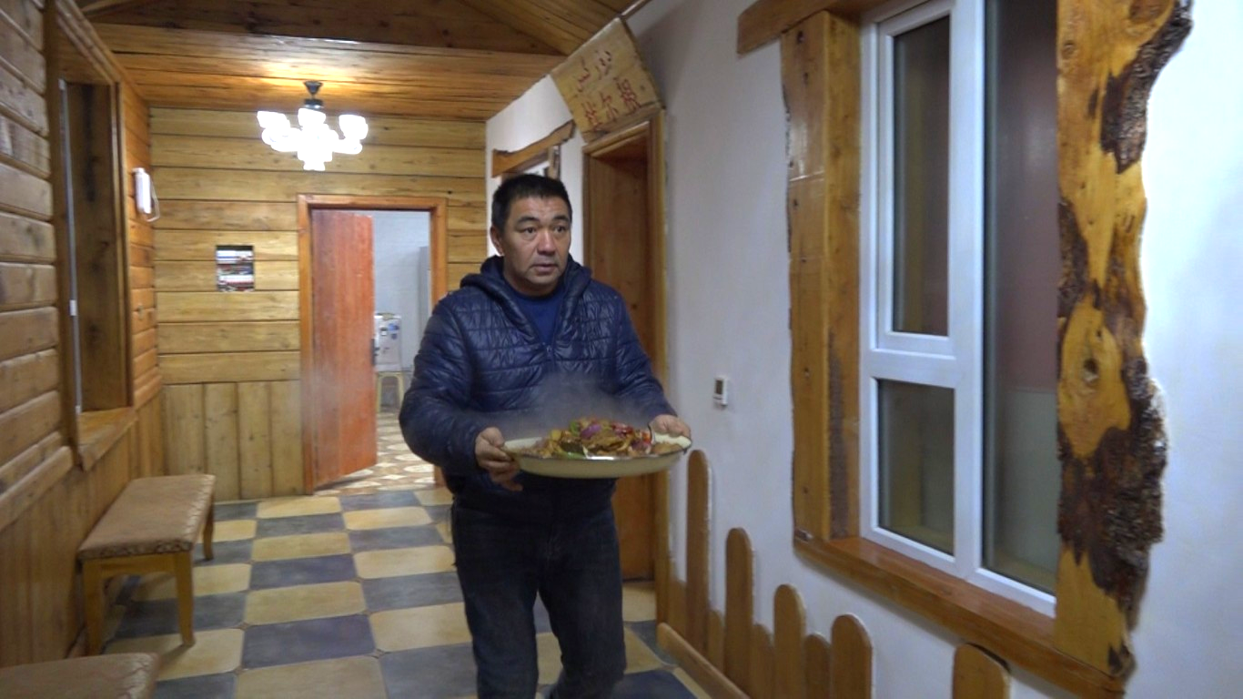 12月21日,装扮一新的福海县木头房子特色农家乐屋内,传统的火炕烧得滚烫,游客在这里喝一杯热气腾腾的奶茶,吃一碗地道的羊肉抓饭,让人温暖一整天。特色的椒麻鸡、大盘鸡、冷水鱼、风干肉等美食让游客在欣赏冬日美景的同时体验味蕾的盛宴。木头房子特色农家乐厨师长岩金花说:“随着冬季旅游的不断升温,我们在菜品上下了很多功夫,推出富有福海特色的美食,让游客欢心而来、味蕾美‘胃’而归。”