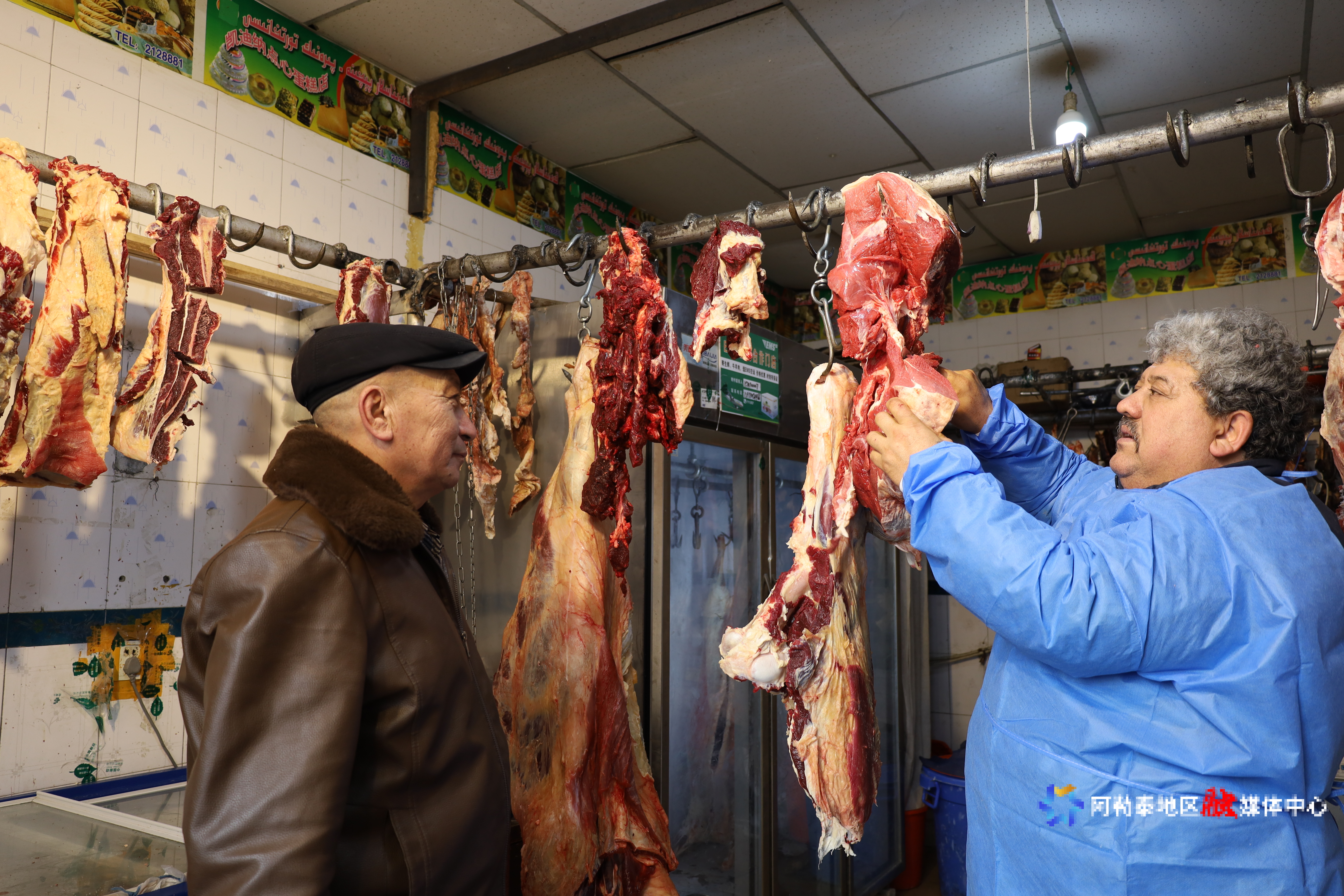 在阿勒泰市某牛羊肉店,老板买买提正在忙着招呼顾客。他说:“连续几天,前来购买牛羊肉的顾客很多,我们的货源充足,完全能够满足大家的需求。”