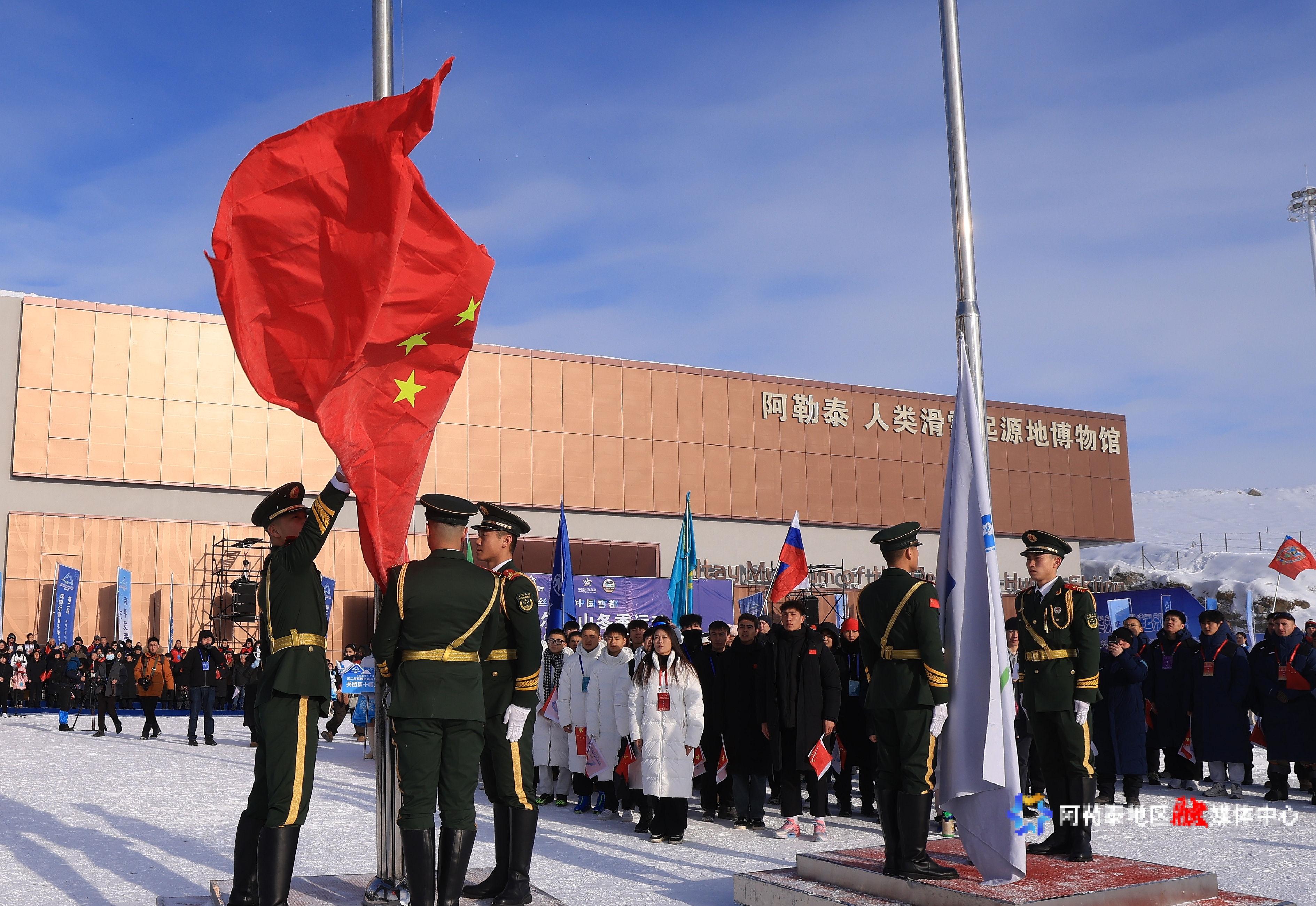 之后,伴随着第二届环阿尔泰山冬运会会歌的旋律,会旗徐徐升起。