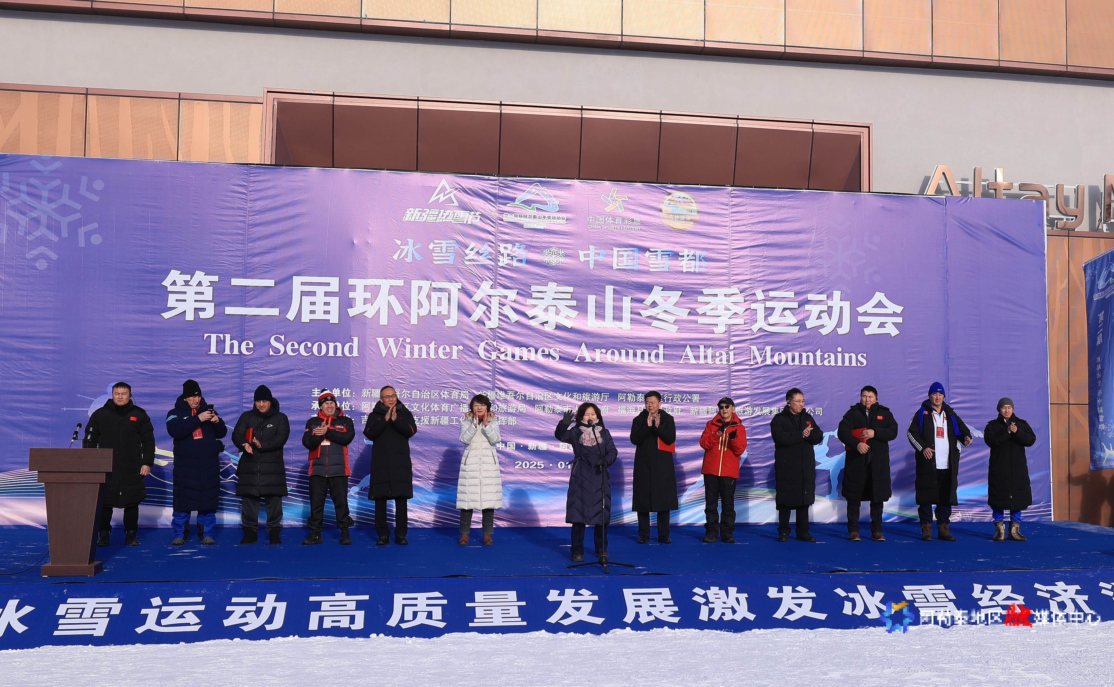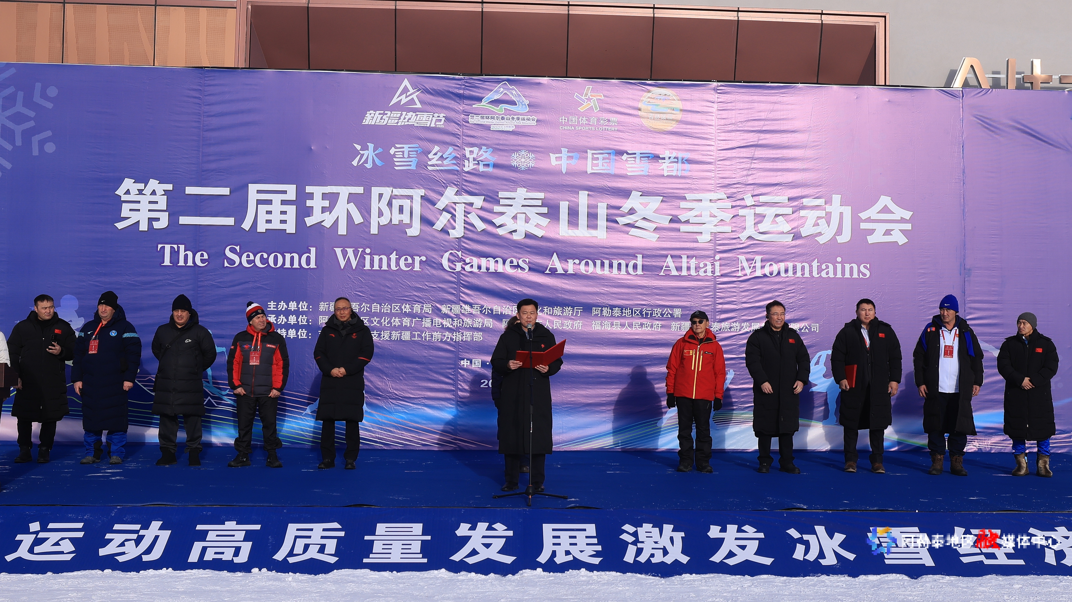 阿勒泰地委委员、秘书长、宣传部部长蓝盛新在致辞中代表阿勒泰地委、地区行署和雪都儿女向出席第二届环阿尔泰山冬运会的各位嘉宾表示热烈欢迎,祝愿全体运动员创造佳绩、成就梦想、增进友谊、收获幸福,并期待通过此次盛会,与大家携手同行,传承和平友谊、促进团结进步、深化交流合作,让共同发展、开放融通之路越走越宽。