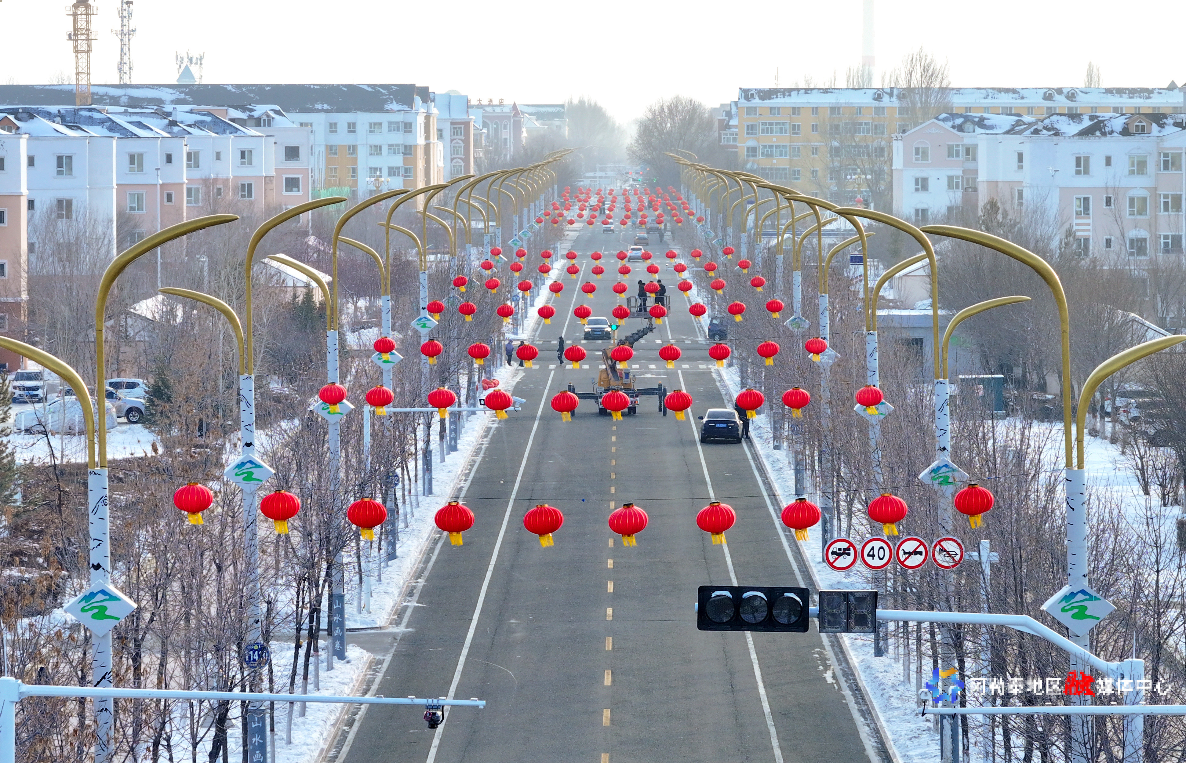 1月7日,在哈巴河县文化路,工作人员在主干道上悬挂大红灯,整条街道被装点得格外喜庆。哈巴河县阿克齐镇居民木合买提·热马赞笑着说:“挂上了大红灯笼,看着就喜庆。老百姓的日子越过越好,传统的喜庆劲儿和温馨感一直都在!”