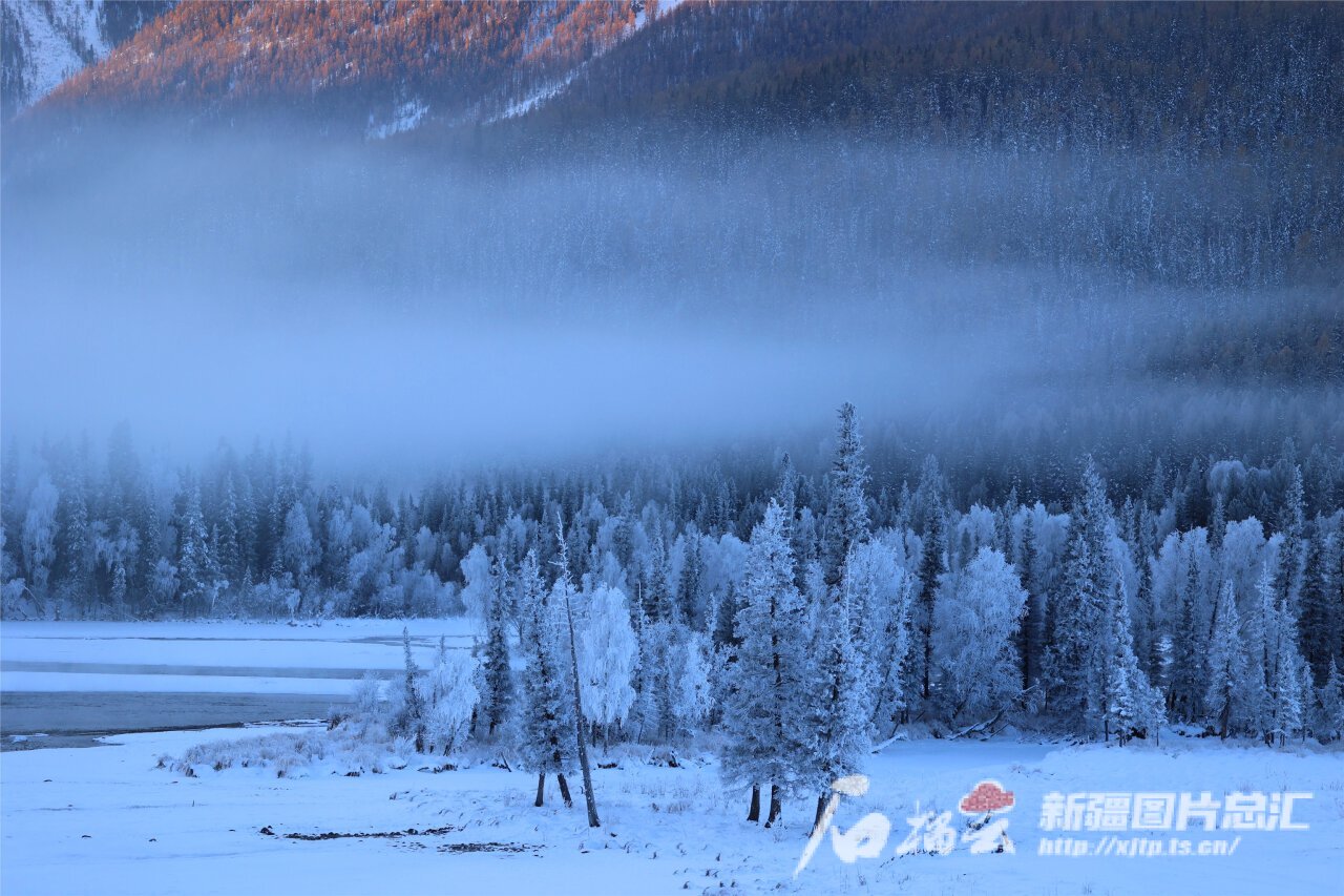 2023年11月14日,阿勒泰地区多地陆续迎来降雪,位于布尔津县的禾木景区出现雾凇景观。刘是何摄