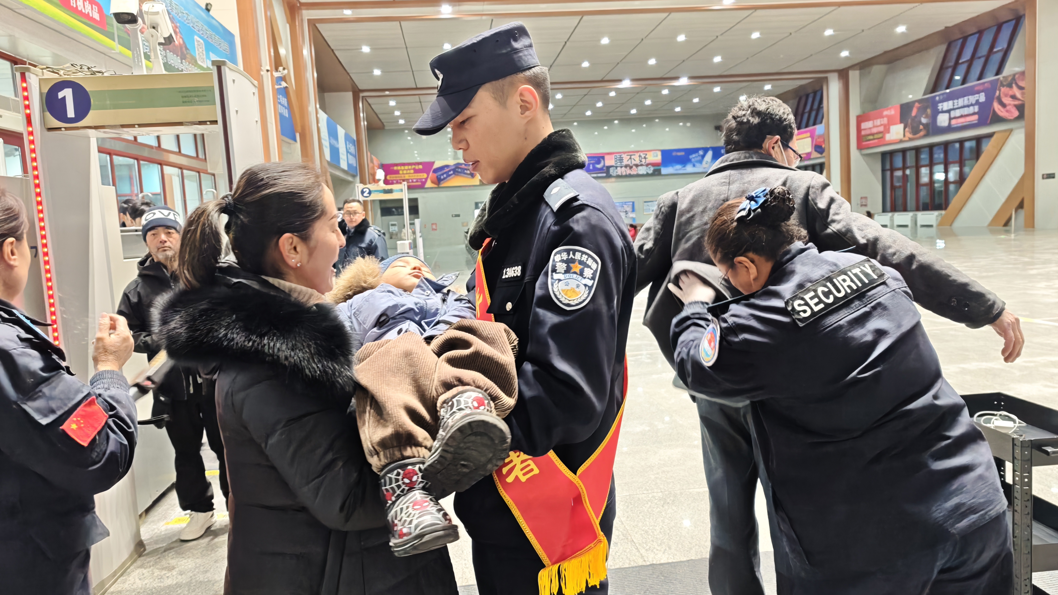 在进站口,雪都铁警化身“导游”,热心协助工作人员进行安检引导,帮助旅客搬运行李,引导旅客有序就座。他们的身影在人群中穿梭,用实际行动传递着关怀与温暖。