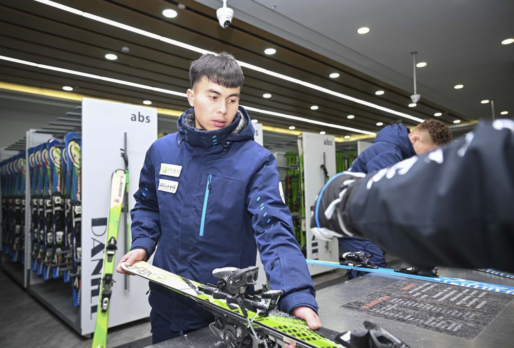 将军山国际滑雪度假区员工斯拉吉丁·热依木为“雪友”整理滑雪板(1月24日摄)。他毕业后在这里工作已有四年。 新华社记者 胡虎虎 摄