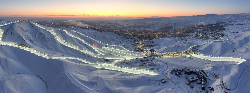 黄昏时分的将军山国际滑雪度假区(1月24日摄,无人机照片)。将军山国际滑雪度假区在夜间开放多条雪道,以满足“雪友”多样化需求。 新华社记者 胡虎虎 摄