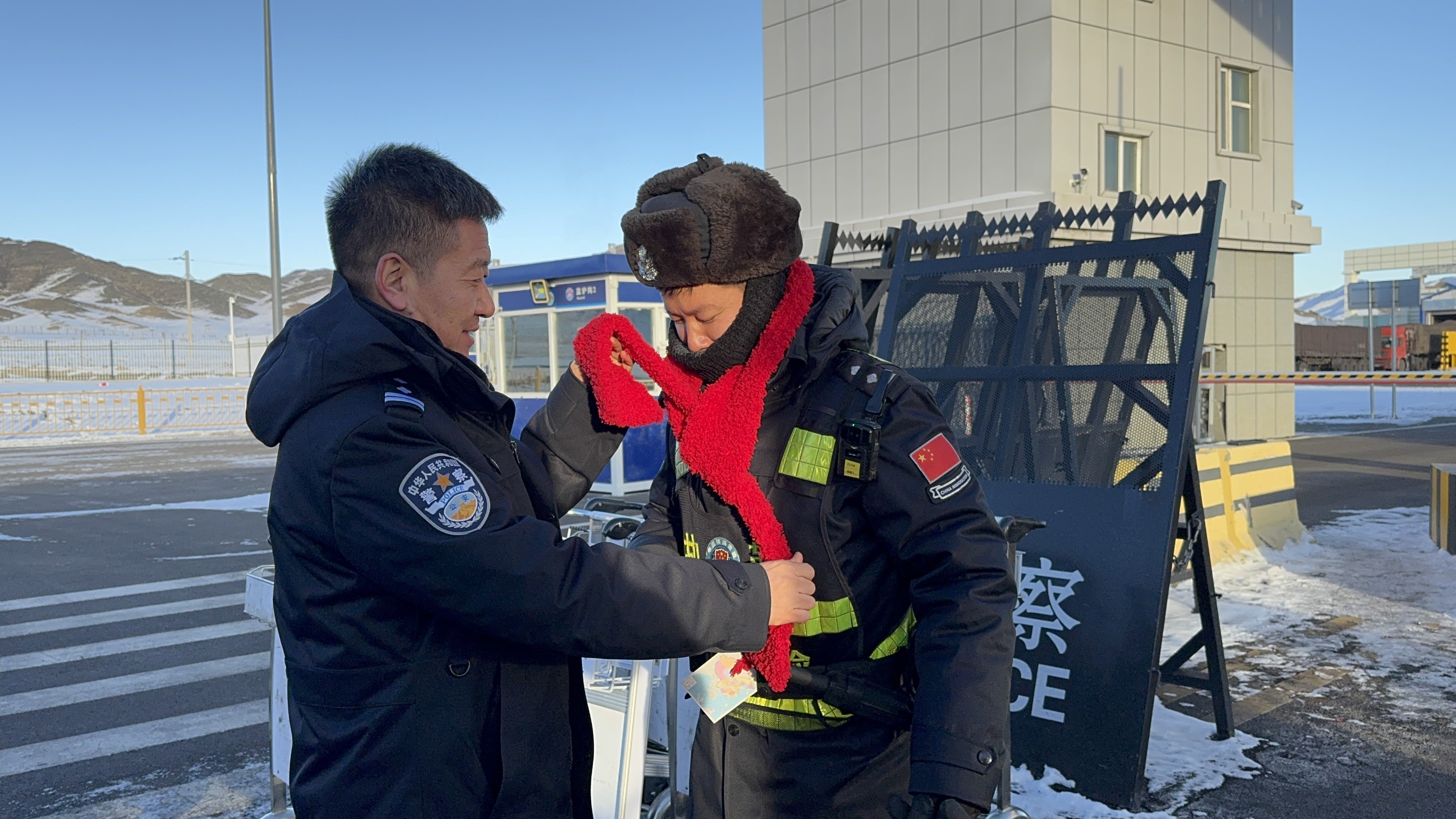 塔克什肯出入境边防检查站庄海涛副站长拿起围巾,亲手为岗位上的民警们一一佩戴。