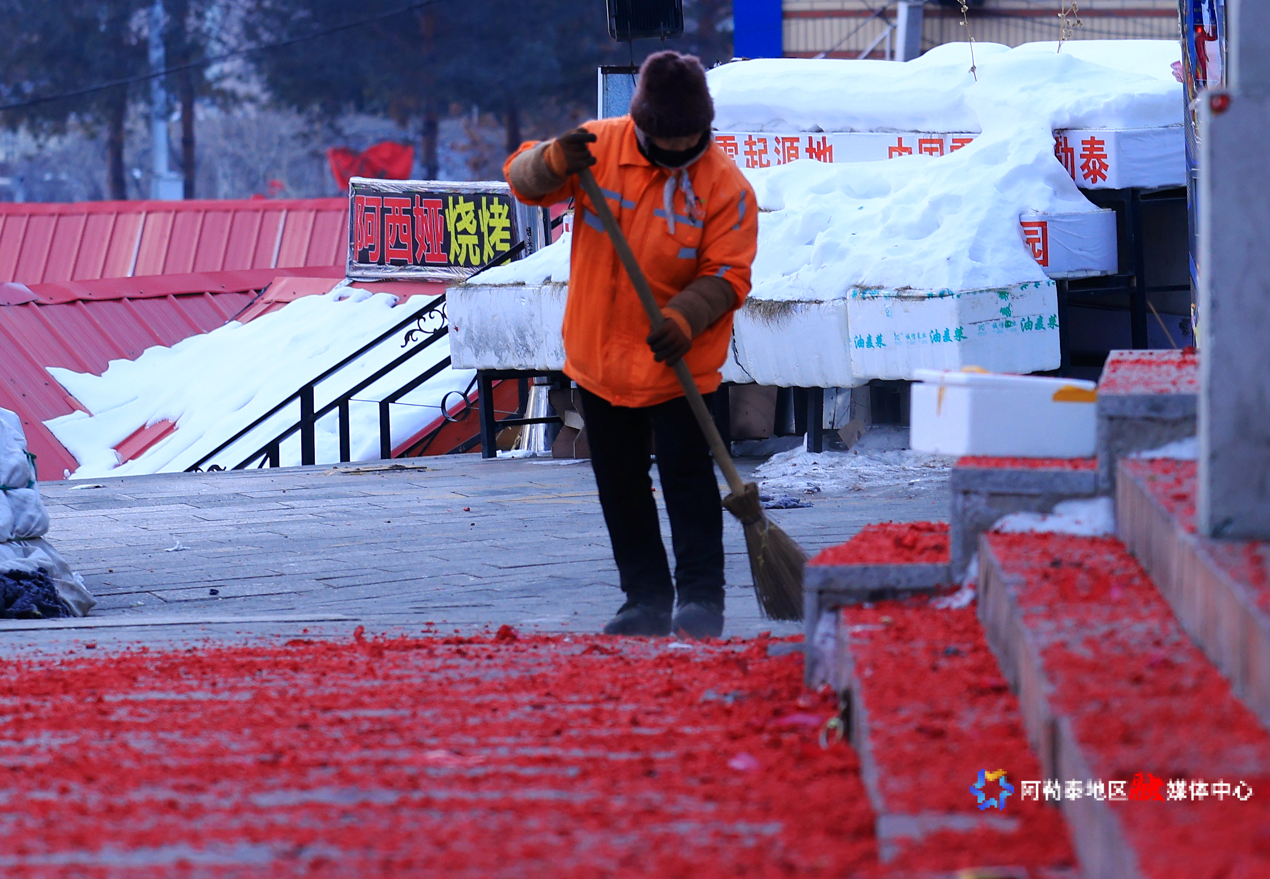 在热闹的街头巷尾,阿勒泰市的环卫工人们正在进行保洁作业。他们默默清扫着街道上的垃圾和积雪,为广大市民及游客提供干净、整洁的生活环境。他们的坚守,让城市的面貌焕然一新,让这个春节更加清新宜人。