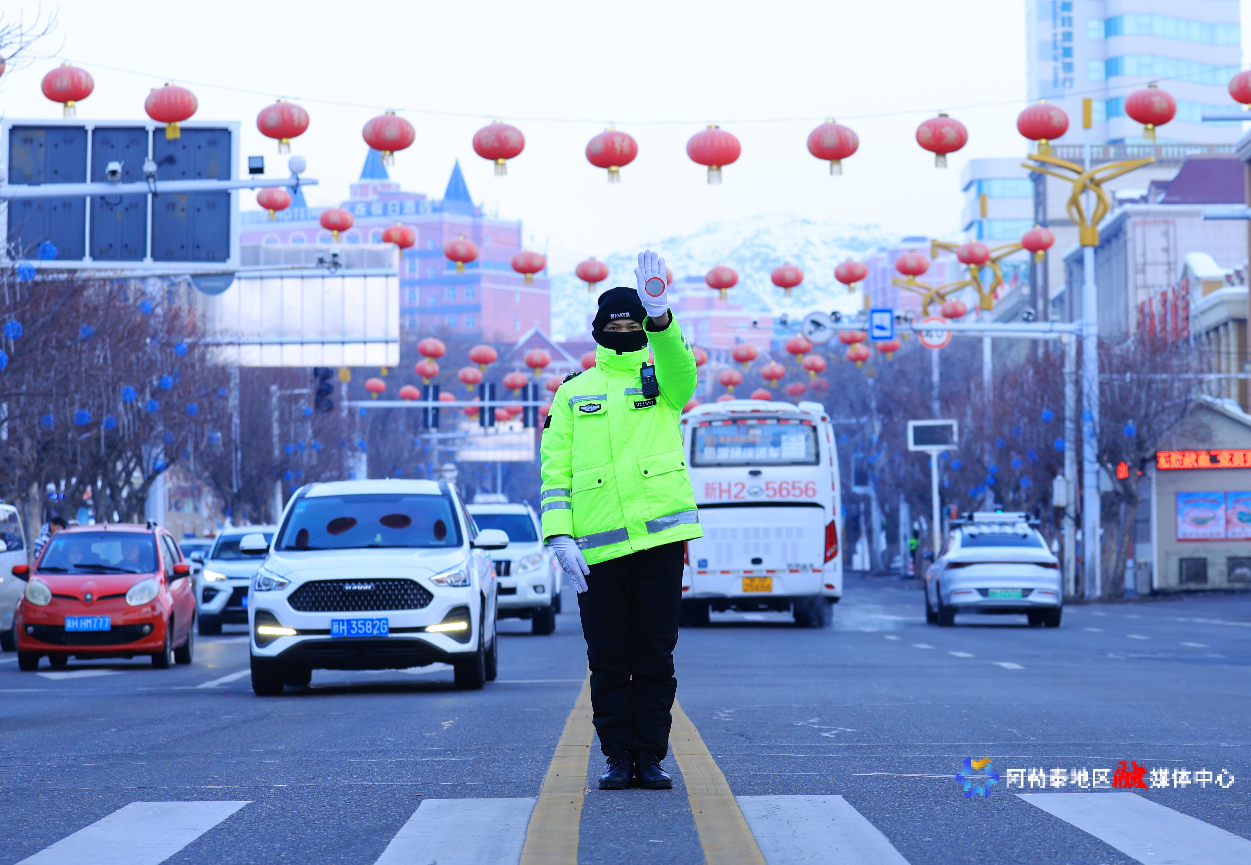 在交通路口,阿勒泰市公安局交警大队的民警们正在指挥疏导着车辆通行,他们手势规范、指挥有力,确保着道路交通安全顺畅。他们的坚守,让广大市民及游客的出行更加便捷、安全,让这个春节更加和谐有序。