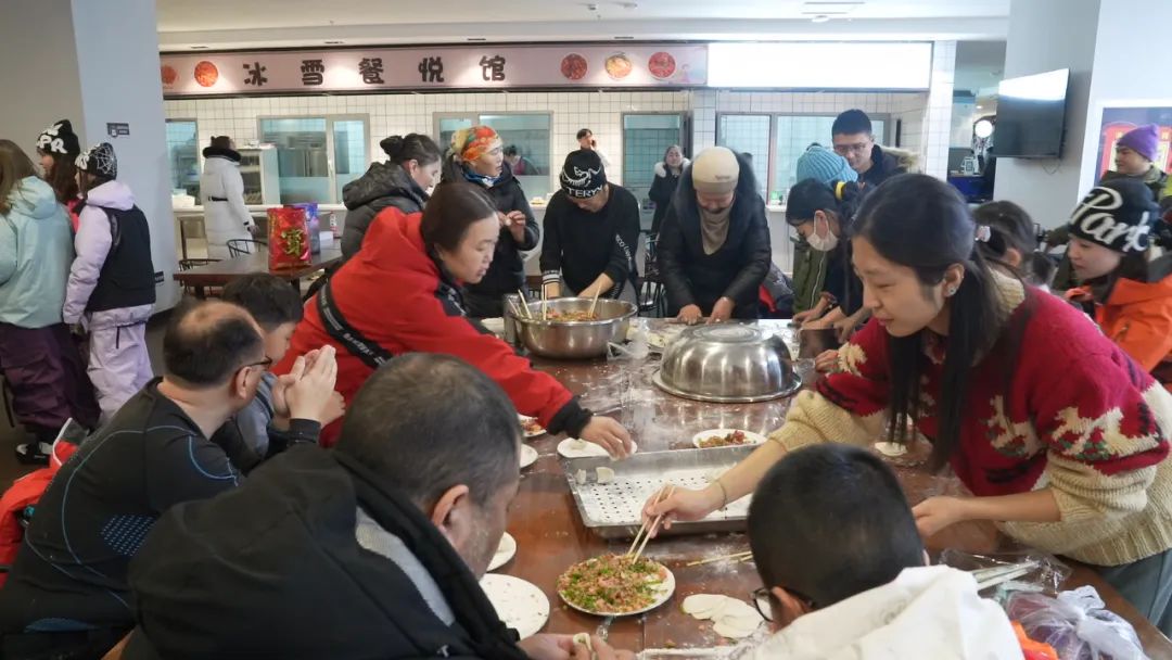 在美食区,游客们吃着热乎乎的饺子,感受青河的温暖。来自江西南昌的滑雪爱好者吴丹丹说:“我是第一次在青河过年,白天可以滑雪,傍晚还有音乐节,大家一起包饺子,非常热闹,过年的氛围感也很浓。今天我的收获,换韧进阶了,同时,包饺子的技术也进阶了。”