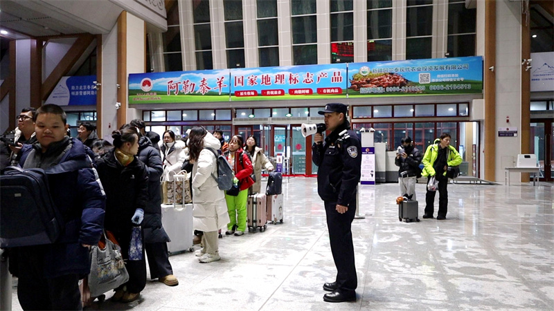 乌鲁木齐铁路公安局奎屯公安处阿勒泰站派出所民警李豪说:“春节假期,根据我们的执勤观察,来到阿勒泰的旅客数量明显多于离开的旅客,其中,游客占据了相当大的比例。为确保旅客的顺畅出行,我们民警还组成志愿服务队,在站内积极开展志愿服务活动,帮助大家顺利进出站。”