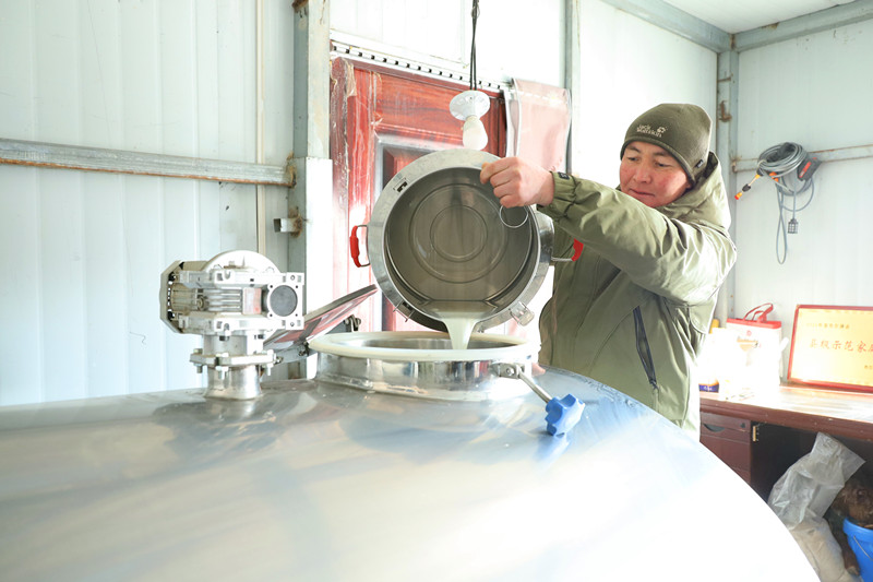 “2023年,我从昌吉引进了6头荷斯坦牛,专门用于挤奶,再通过鲜奶专卖店进行对外销售。现在每头牛每天产奶量在20公斤左右,一天可销售鲜奶100公斤,剩下的鲜奶用于加工坊生产酸奶、奶疙瘩等奶制品。今年,我计划引进一些高产奶牛,在扩大规模的同时增加年收入。”朱马尔提·亚汗说。