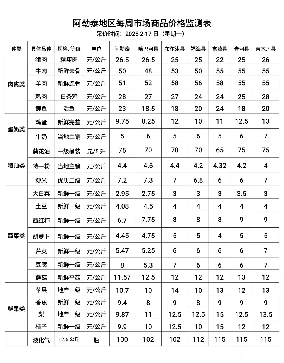 阿勒泰地区每周市场商品价格监测表