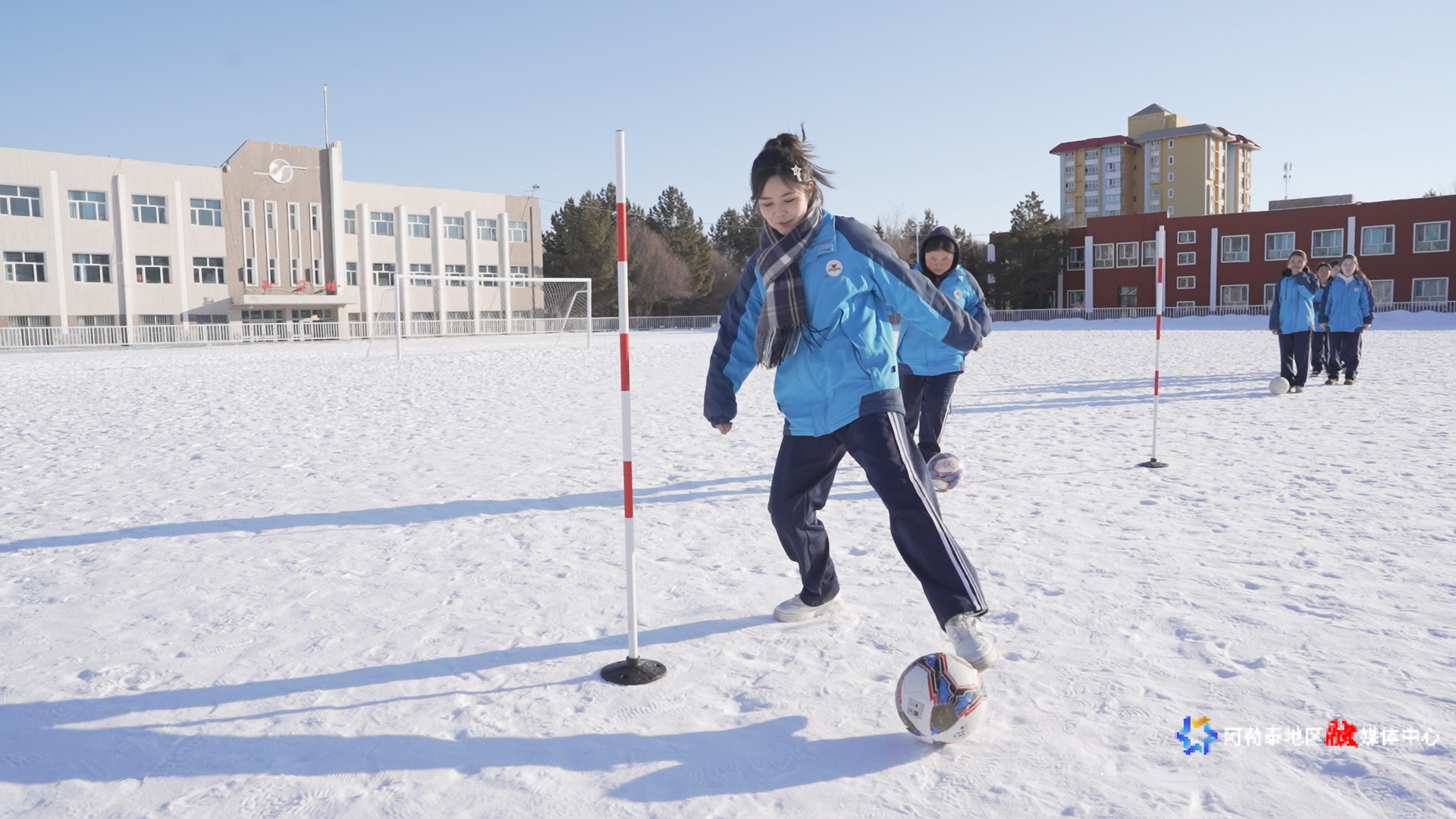 2月19日,新疆师范大学附属中学吉木乃县分校初三年级学生德勒娜尔·阿依恒和同学们正在进行足球训练,欢声笑语回荡在校园上空。