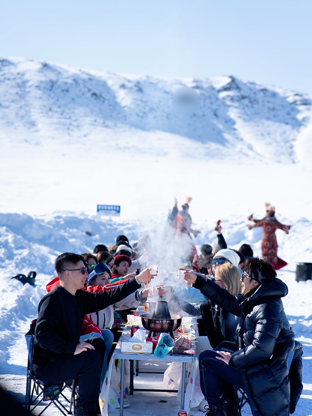 2月21日,在蒙克牧场,游客围炉而坐,一边品尝热腾腾的火锅,一边欣赏雪景。