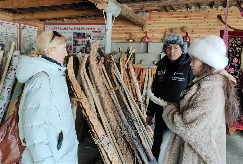 2月24日上午,“网红新疆四季行”媒体团走进阿勒泰市,探访了自治区级非物质文化遗产代表性项目古老毛皮滑雪板制作技艺代表性传承人斯兰别克·沙合什的工作坊。斯兰别克·沙合什热情接待了媒体团,并生动讲述了古老毛皮滑雪板背后的故事。他详细介绍了毛皮滑雪板的选材和制作工艺,媒体团成员们近距离观察了毛皮滑雪板的制作过程,深刻感受到阿勒泰作为“人类滑雪起源地”的深厚文化底蕴。