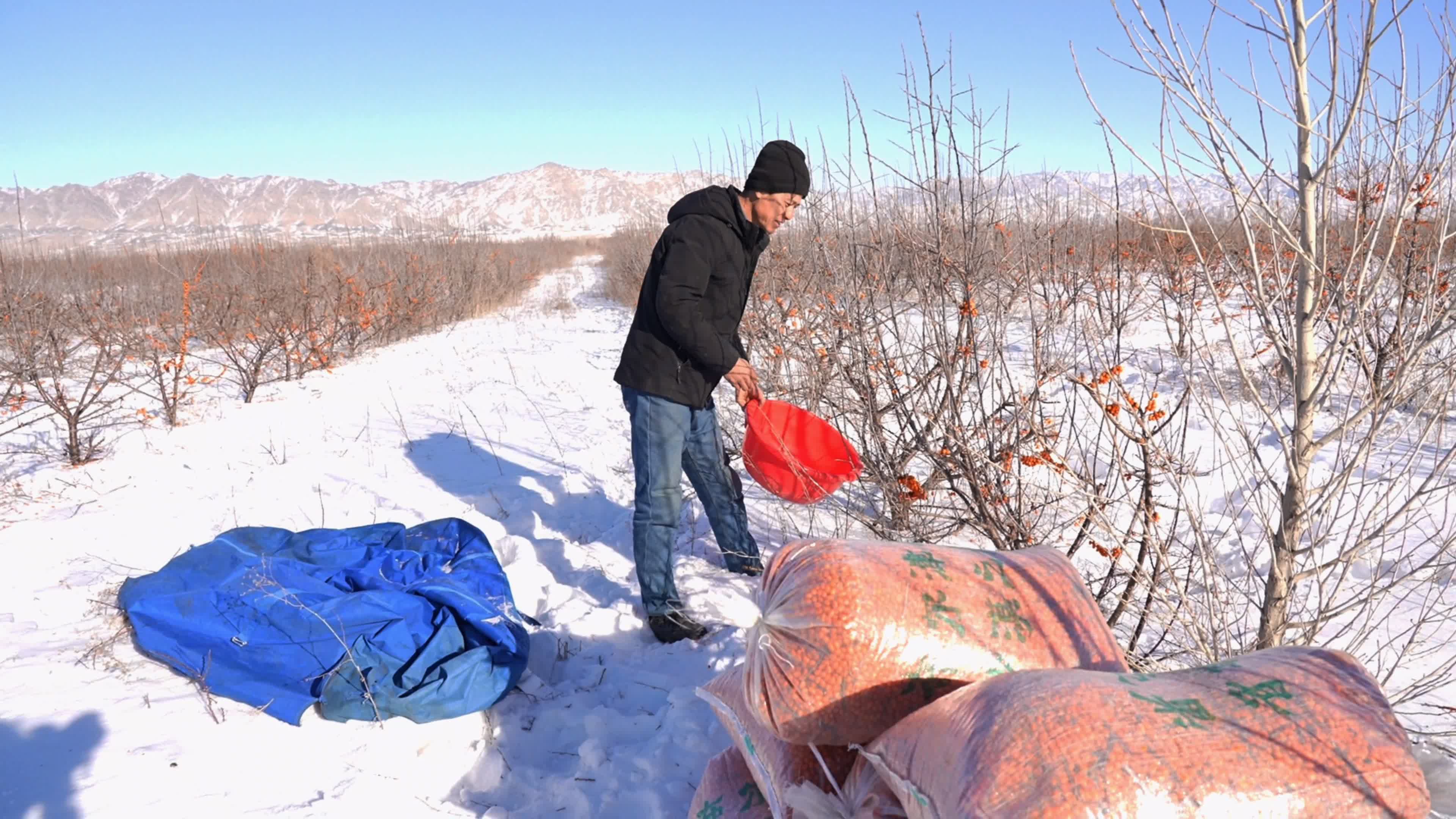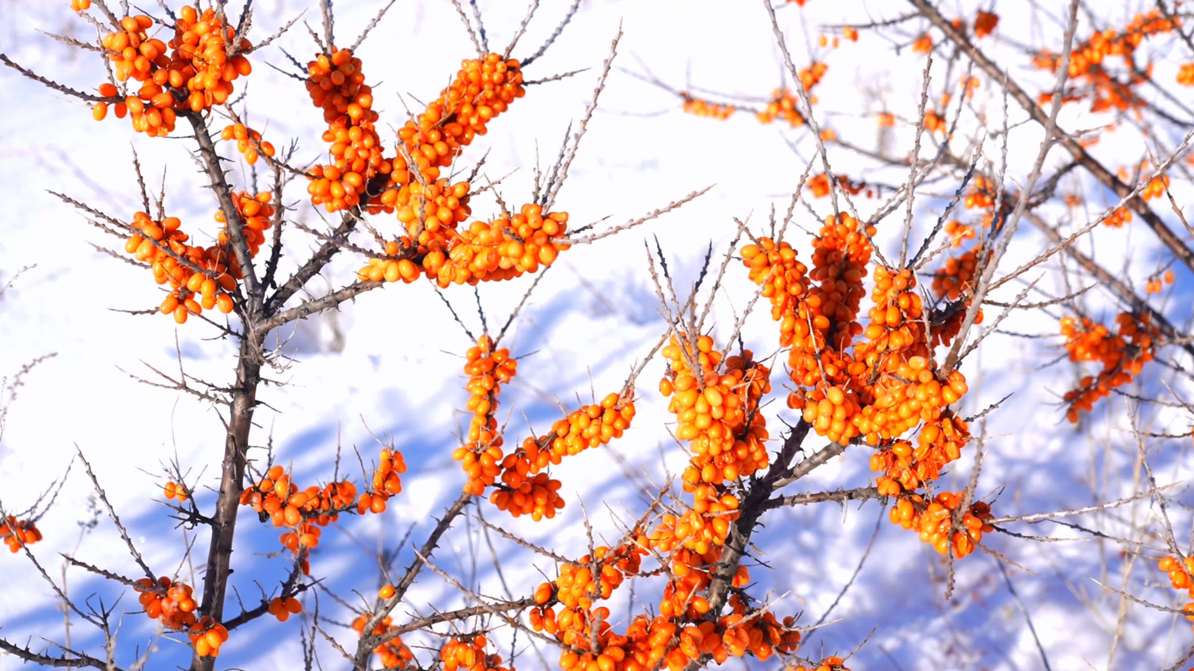 眼下,布尔津县窝依莫克镇阔普巴拉村迎来了沙棘冬果采摘季。2月28日,在布尔津县新长征农牧业发展有限责任公司的有机沙棘种植基地里,一串串火红的大果沙棘与皑皑白雪相映成趣。该沙棘品种成熟期晚、不易破浆、易采摘,尤其在入春后,是采摘的最佳时节。村民们化身采摘工人,穿梭于沙棘林中。