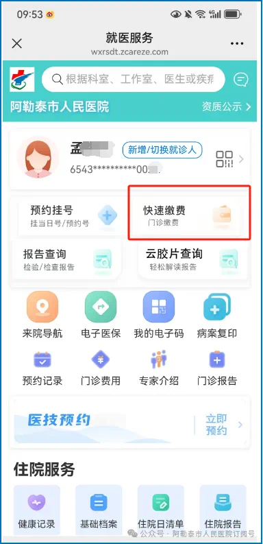 关注“阿勒泰市人民医院”公众号,选择智慧医院—就医服务,医生开具医嘱后,选择快速缴费,使用医保支付(亲情支付)。