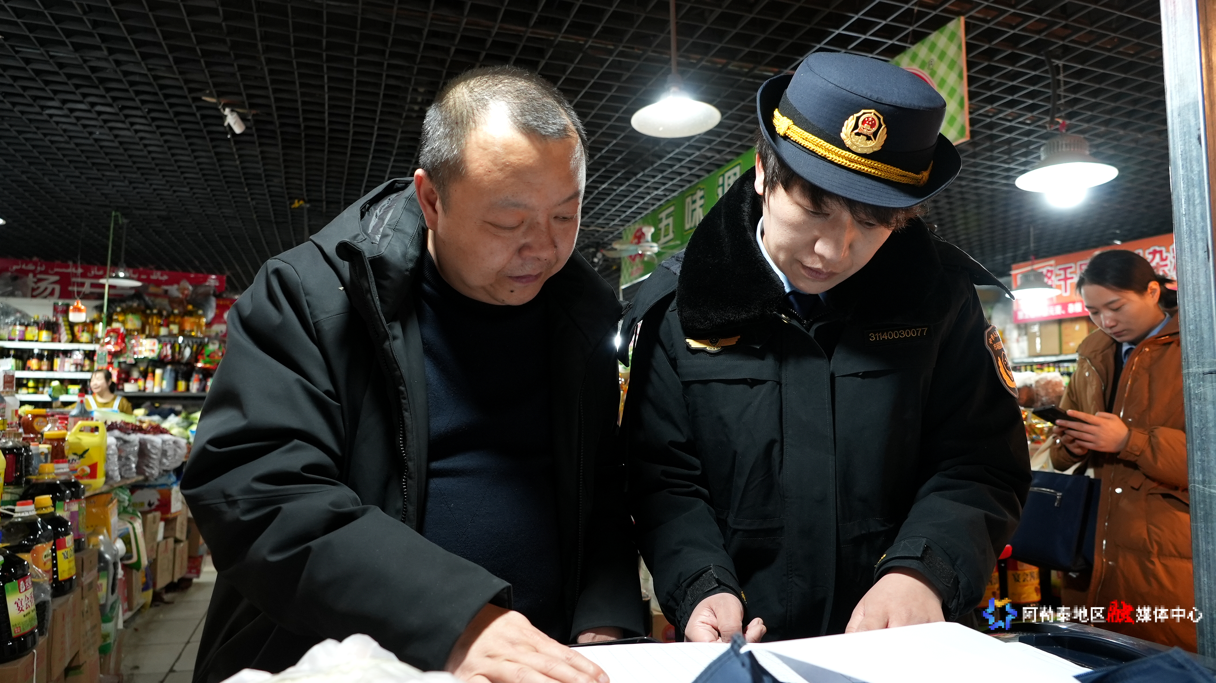 地区市场监督管理局、新疆标检产品检测认证有限公司与商家合影。记者 张福新 摄
