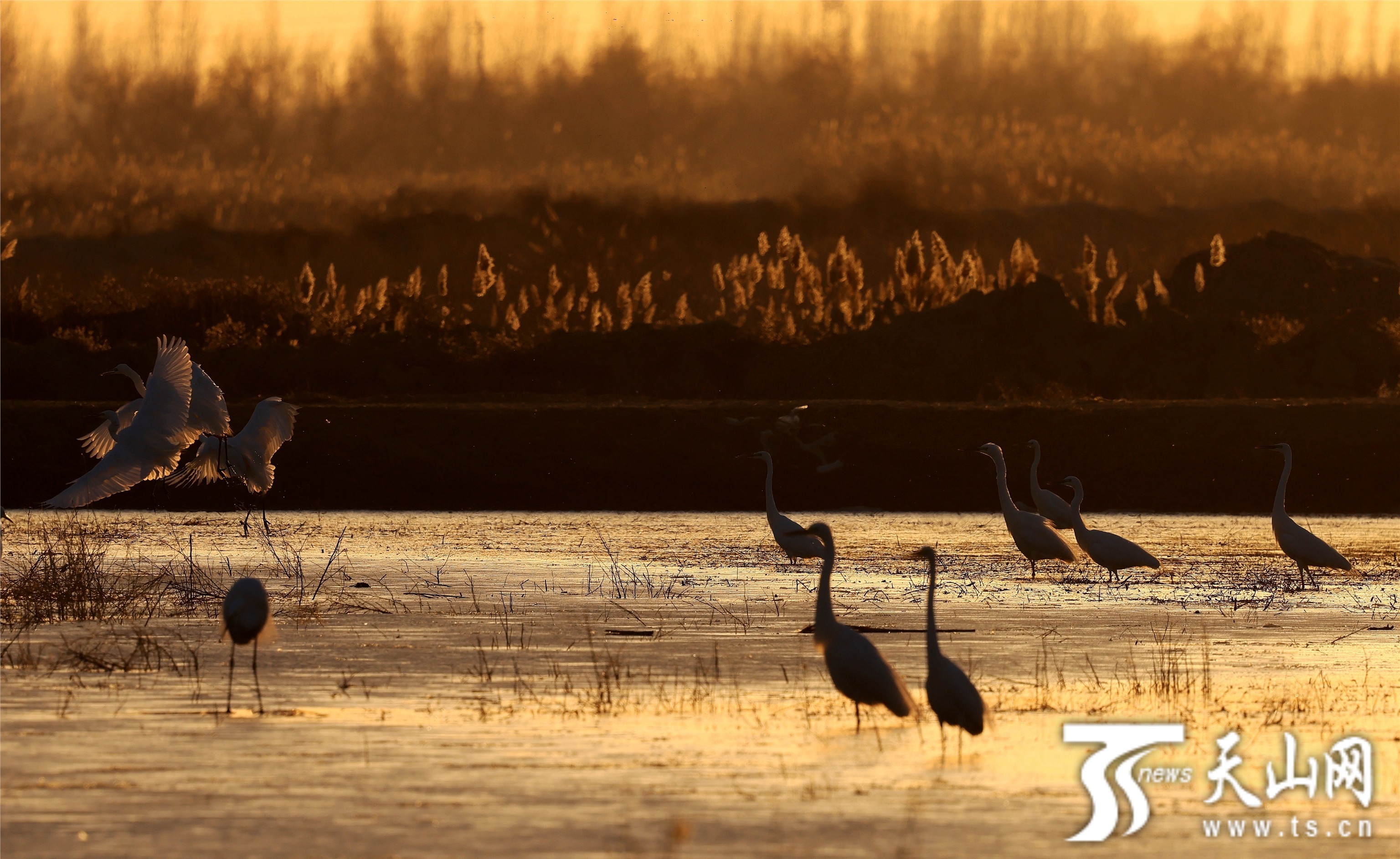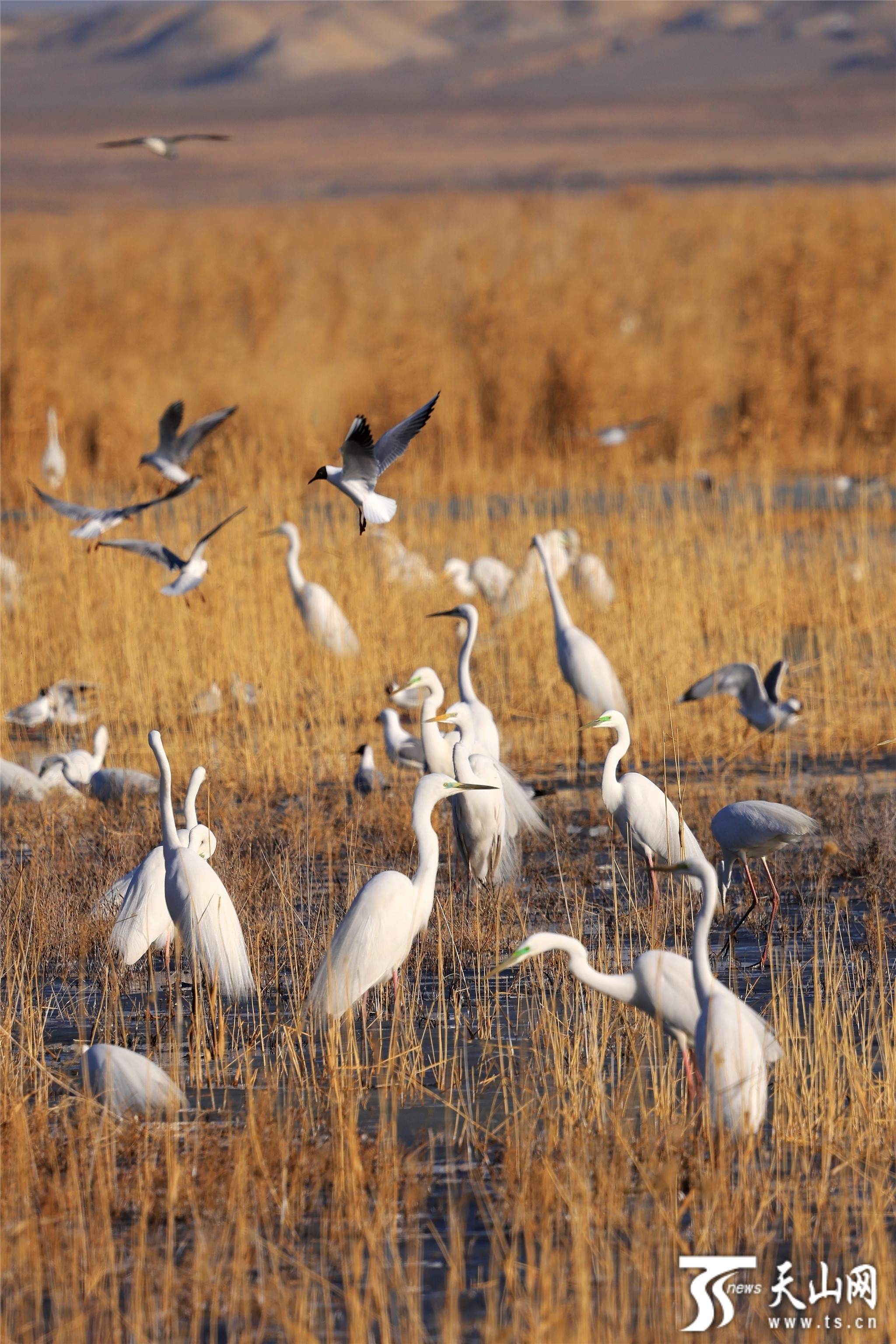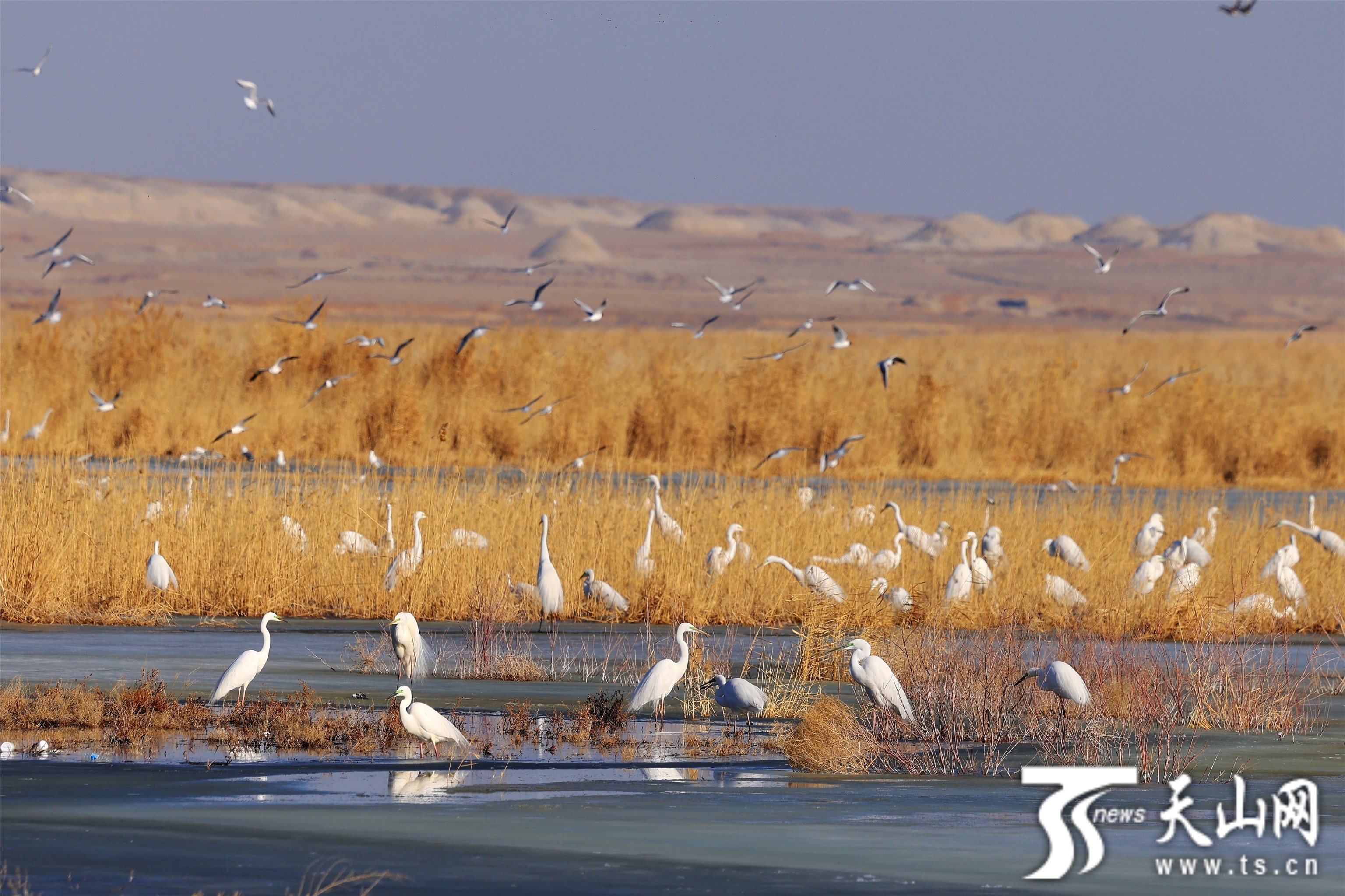3月21日,候鸟在福海县乌伦古湖国家湿地公园休憩。进入3月,天气渐暖,冰雪消融,大批候鸟迁徙至此,良好的生态环境让这里成为候鸟的天堂。阿尔达克·拜斯汗摄