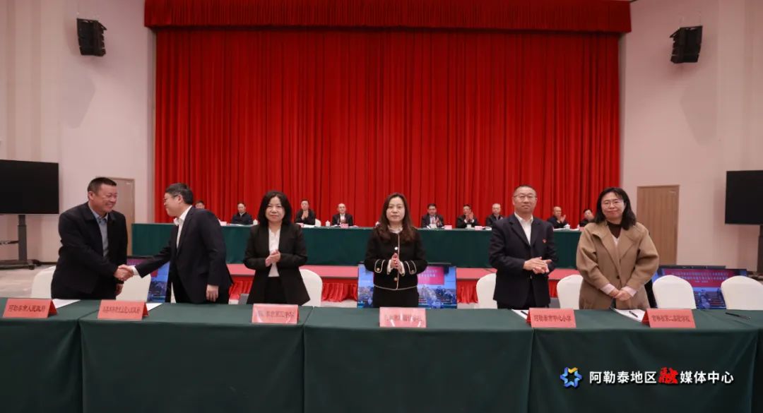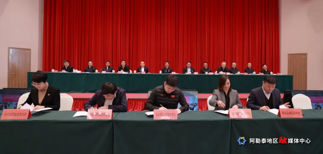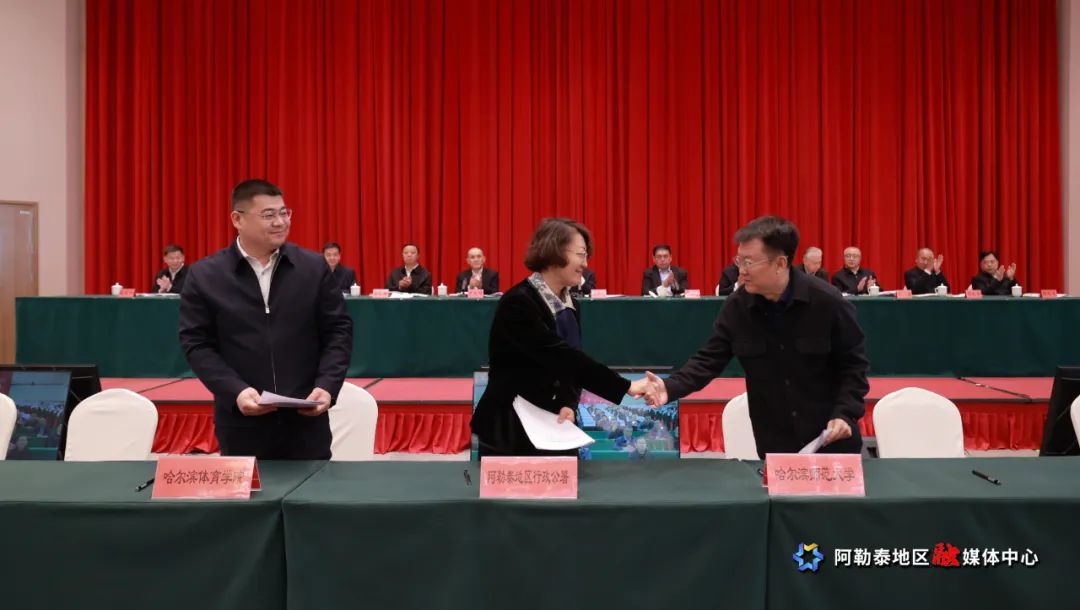 阿勒泰地区行署与哈尔滨师范大学、哈尔滨体育学院签署合作框架协议,地区有关县市及教育部门与14个援疆省市教育部门及乌鲁木齐市天山区签署教育援疆长期合作协议、合作框架协议。