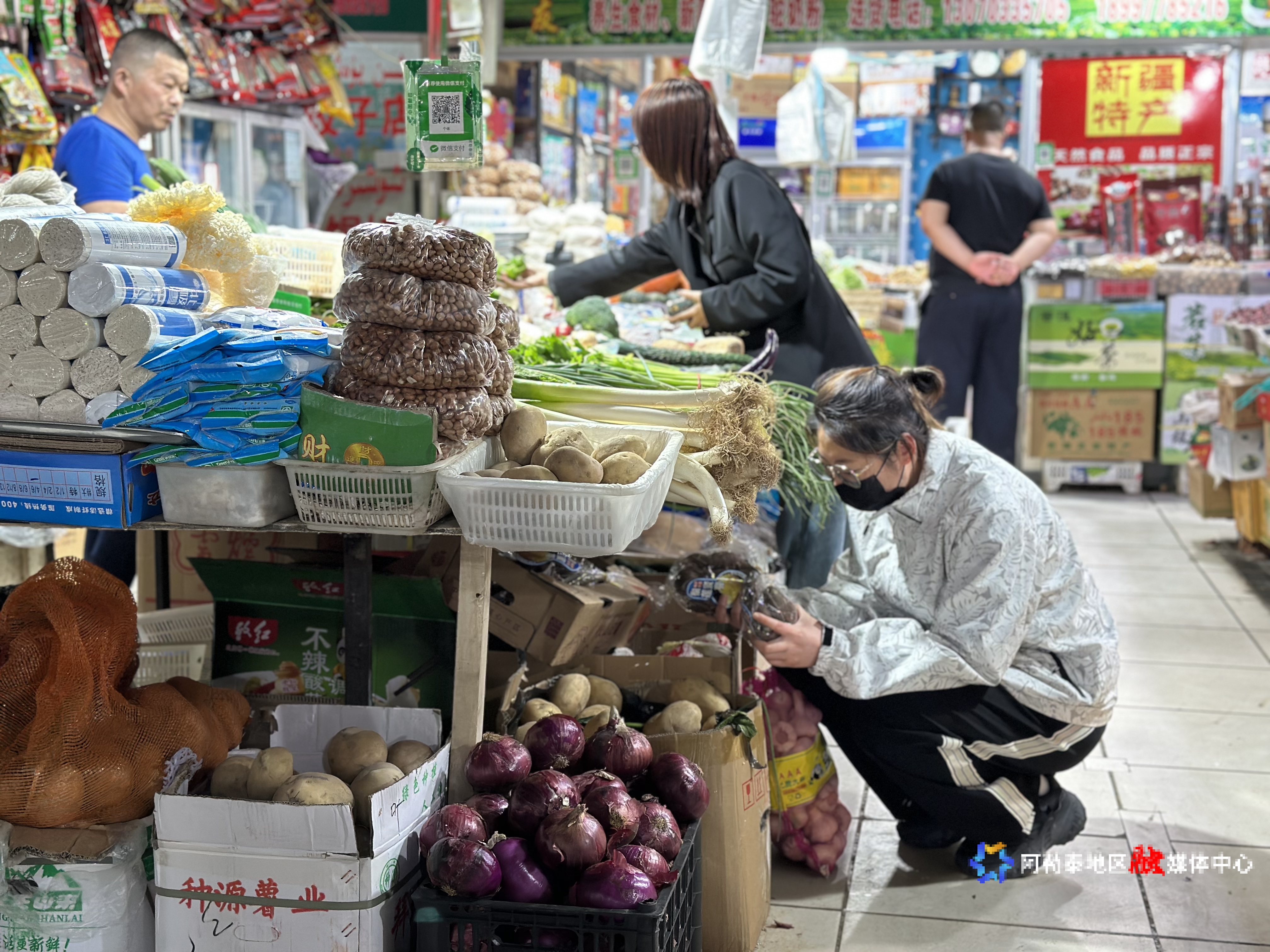 在阿勒泰市四季青农贸市场,蔬菜、水产、肉类摊位前人头攒动,商户们正忙于称重、补货。