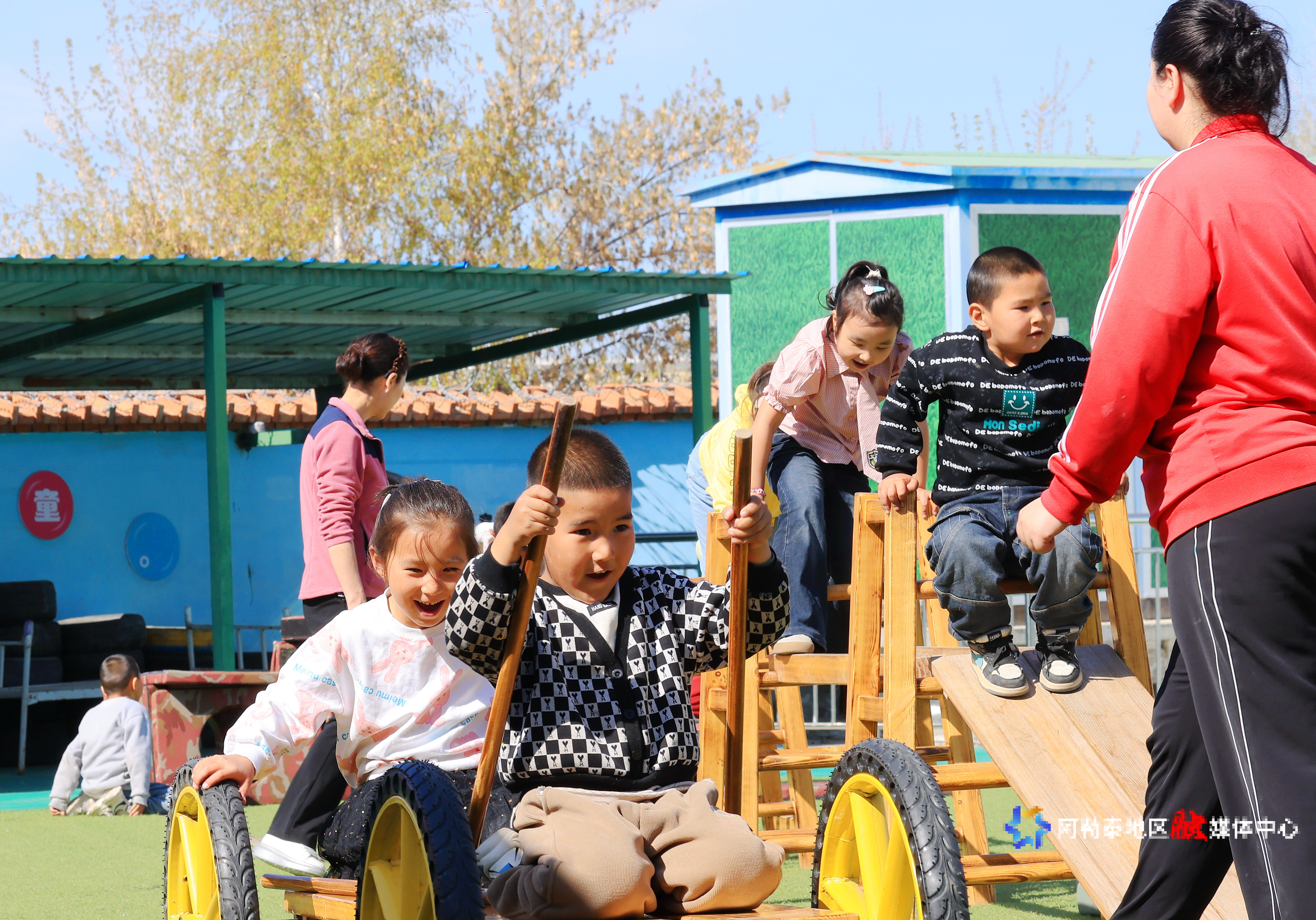 4月27日,阿勒泰市红墩镇中心幼儿园孩子们玩耍四轮车。记者 阿尔达克·拜斯汗 摄