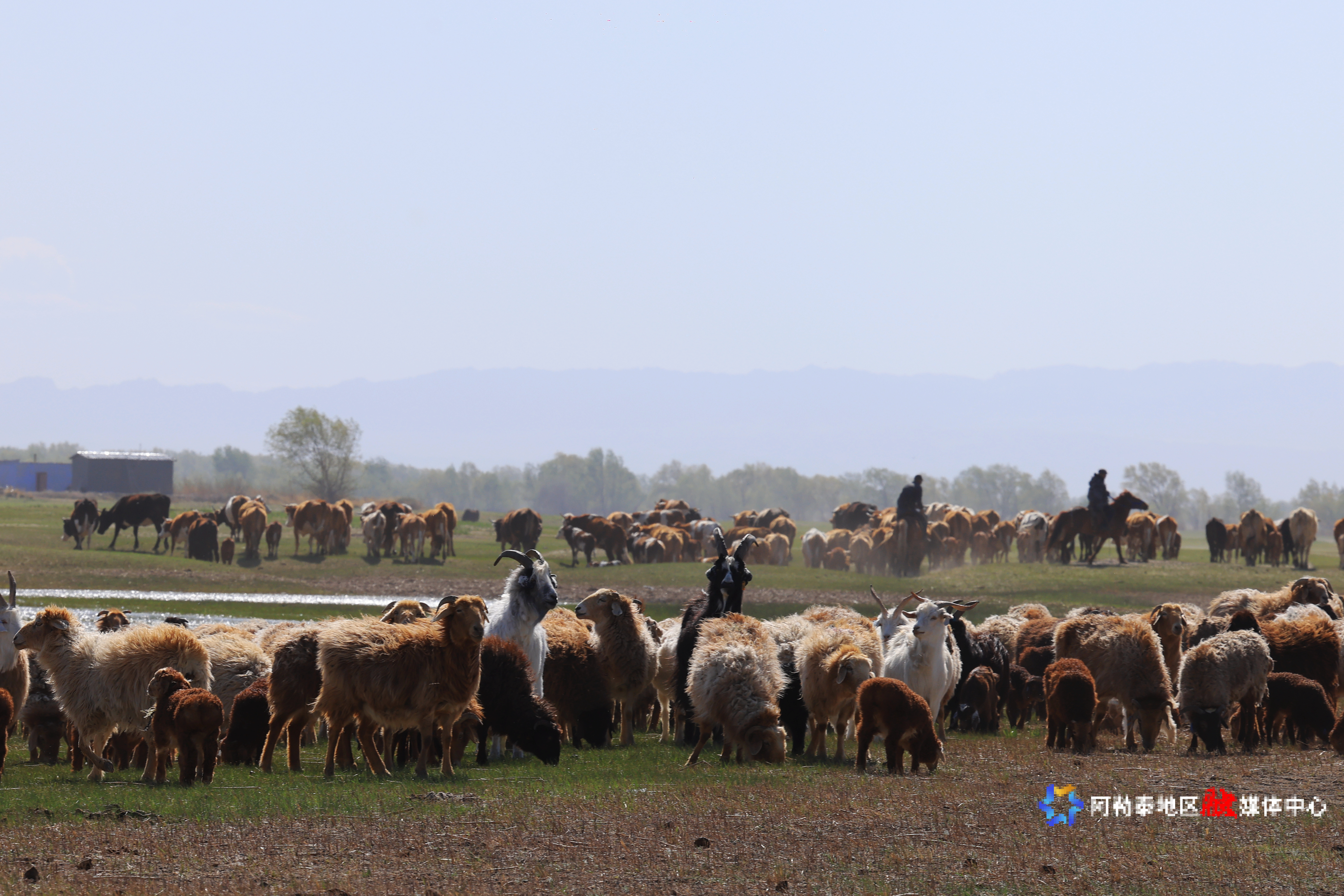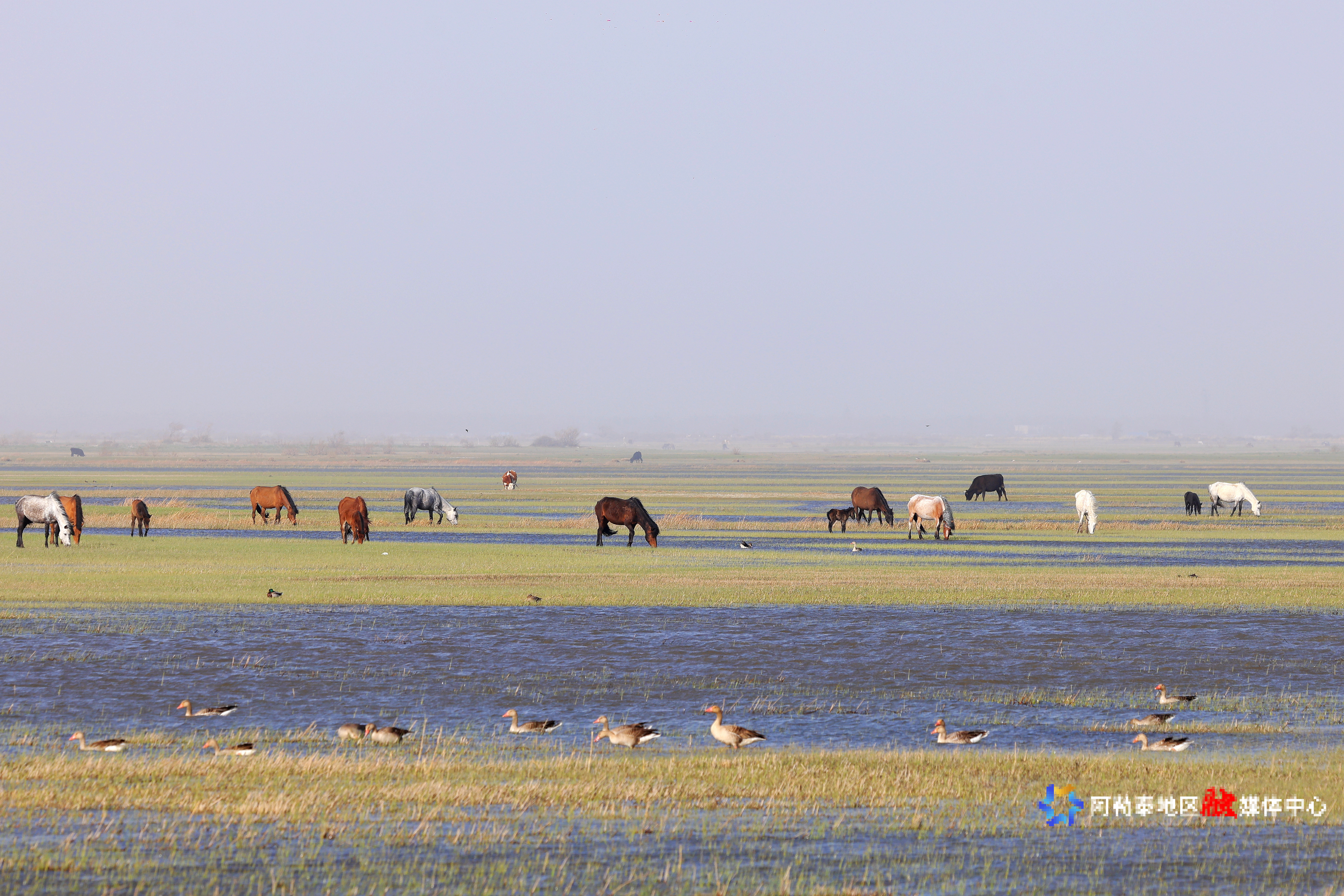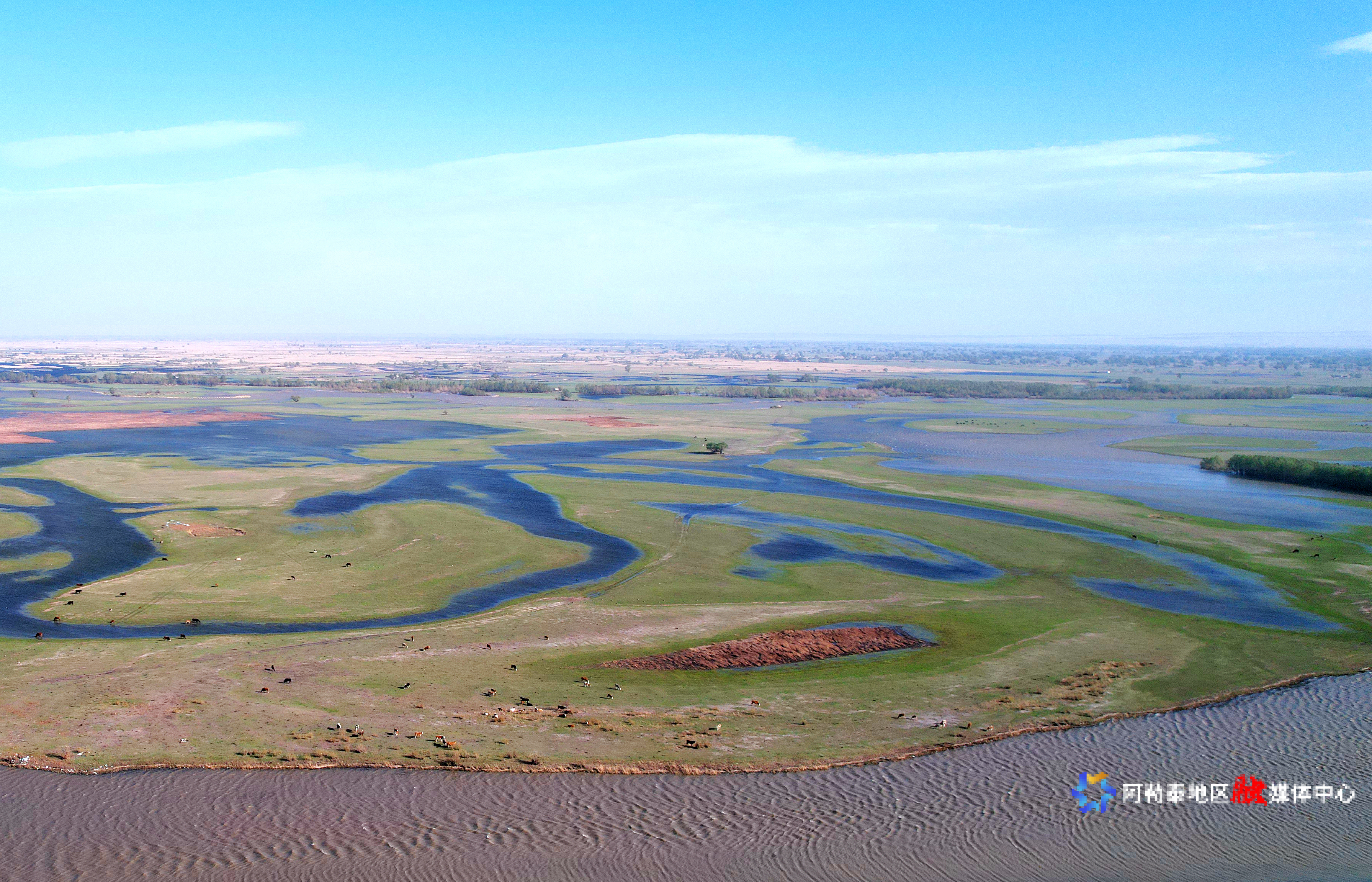 阿勒泰新闻网-阿勒泰地区融媒体中心(记者 阿尔达克·拜斯汗 摄)立夏以来,“我的阿勒泰”悄然换上最美丽的装扮。5月6日,在阿勒泰市克兰河下游,牛羊马驼悠然漫步,野鸭于浅湾处觅食嬉戏,蜿蜒的河水因这些灵动的身影更显勃勃生机。