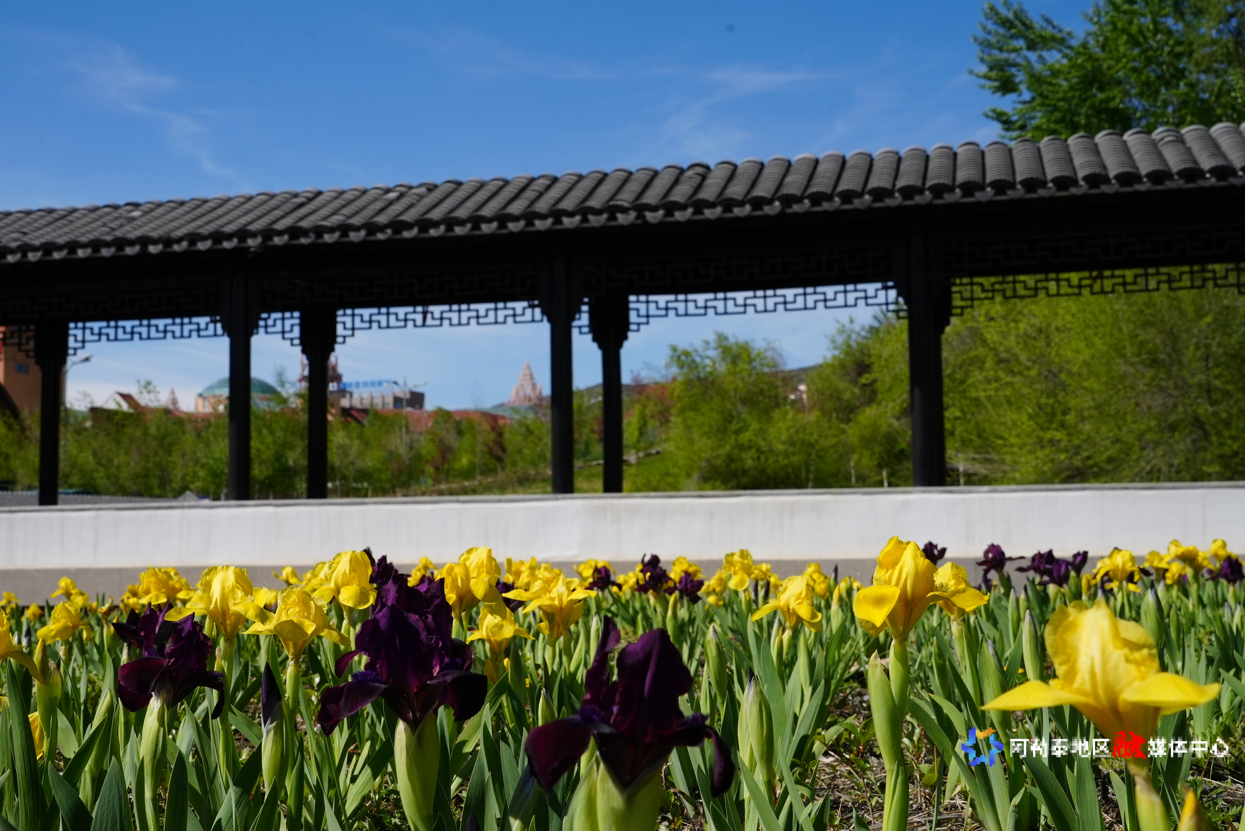 阿勒泰新闻网-阿勒泰地区融媒体中心(记者 代维利)五颜六色雅姿韵,靓丽浓妆美如霞。暮春初夏,阿勒泰市天鹅湖公园内种植的鸢尾花迎风盛放。徜徉其间,成片的鸢尾花瓣轻盈舒展,在蓝天白云下更显娇艳。那些黄色的、紫色的花朵绵延于湖畔与长廊之间,与如茵草甸、古色亭台及澄澈湖面交相辉映,勾勒出一幅灵动画卷。