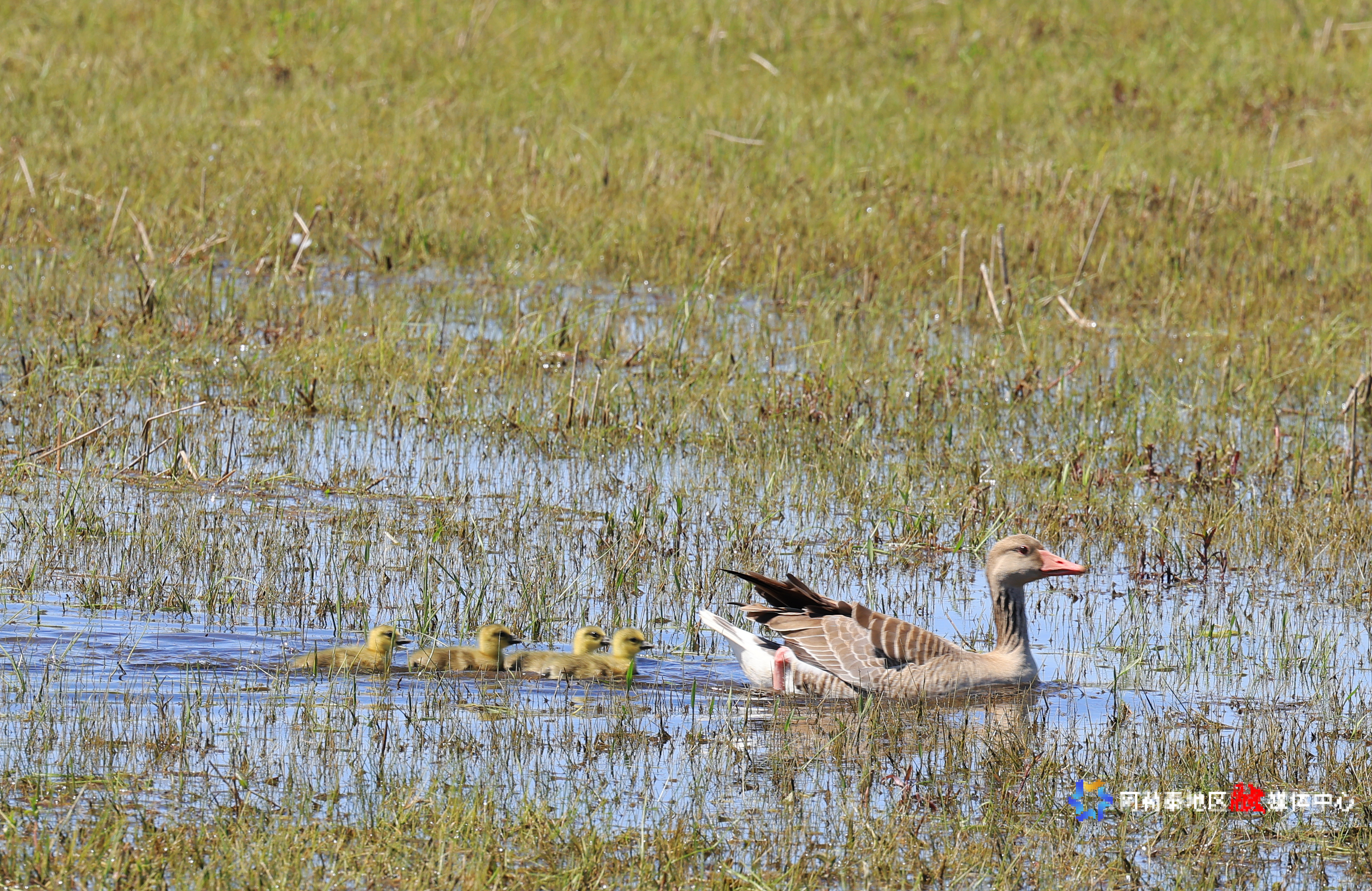 2025年5月8日,阿勒泰科克苏湿地国家级自然保护区,刚孵出的灰雁宝宝,在灰雁爸灰雁妈的守护下戏水觅食,萌态可掬。记者 阿尔达克·拜斯汗 实习记者 塞力克·肯恩斯汗 摄