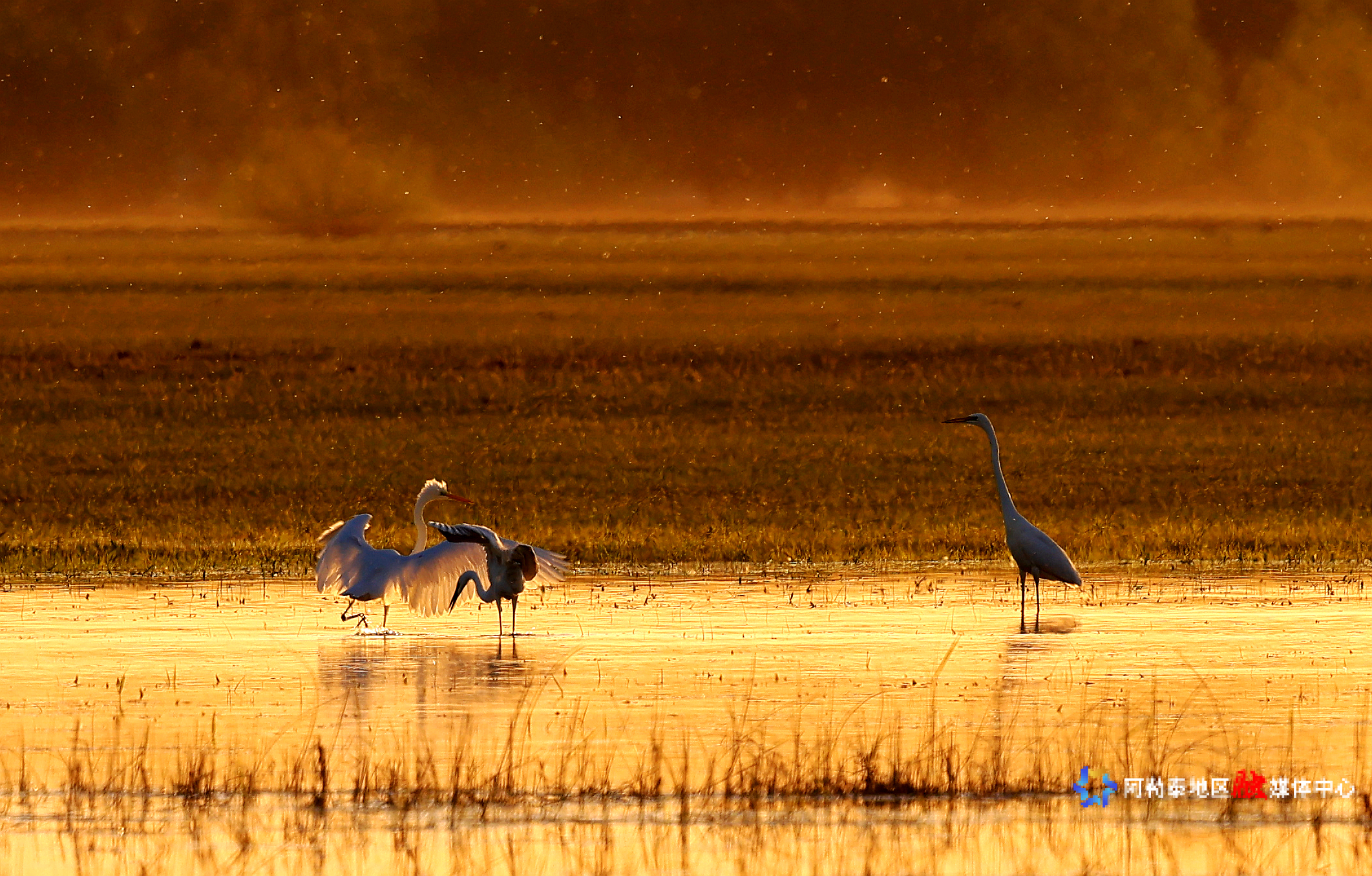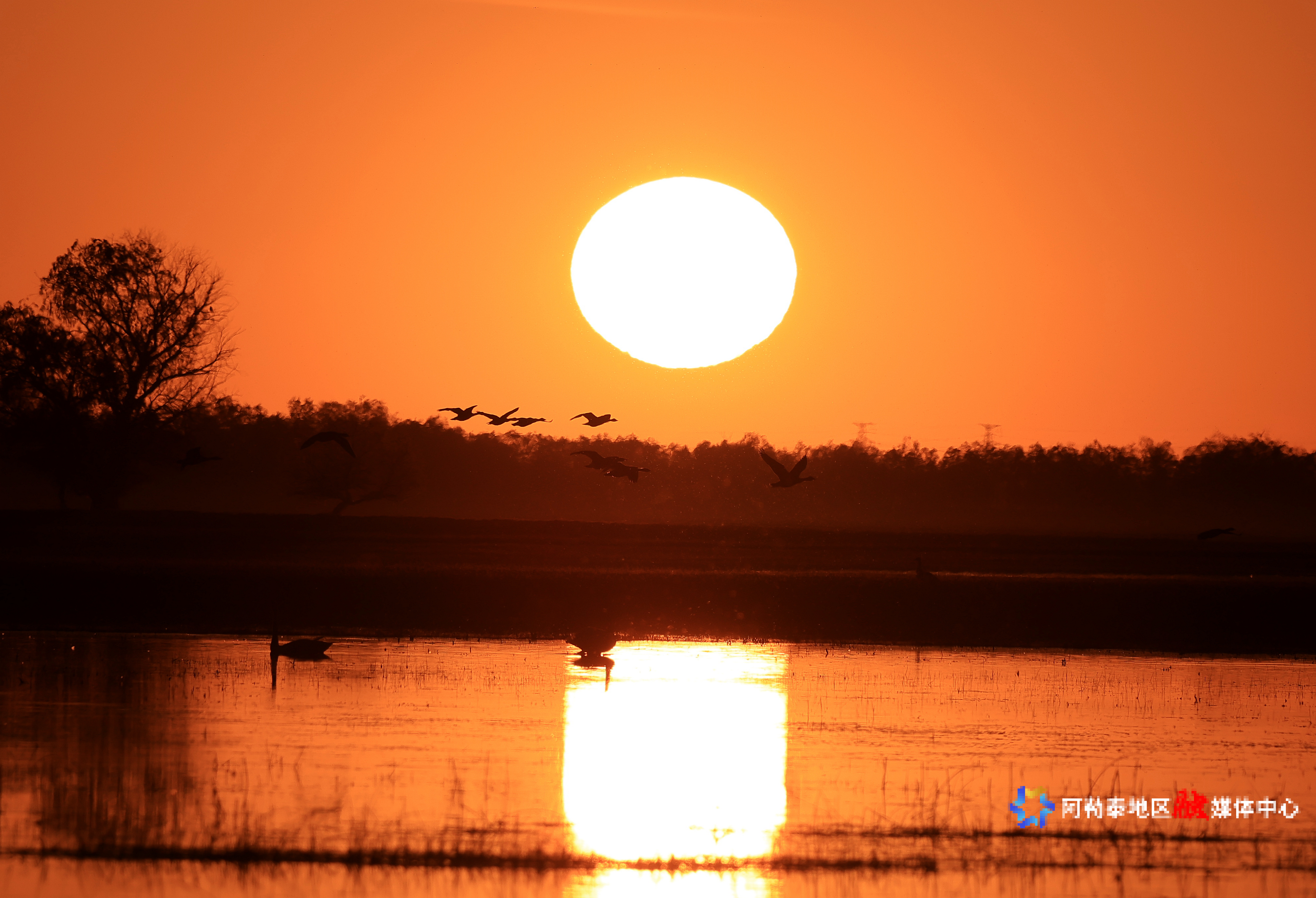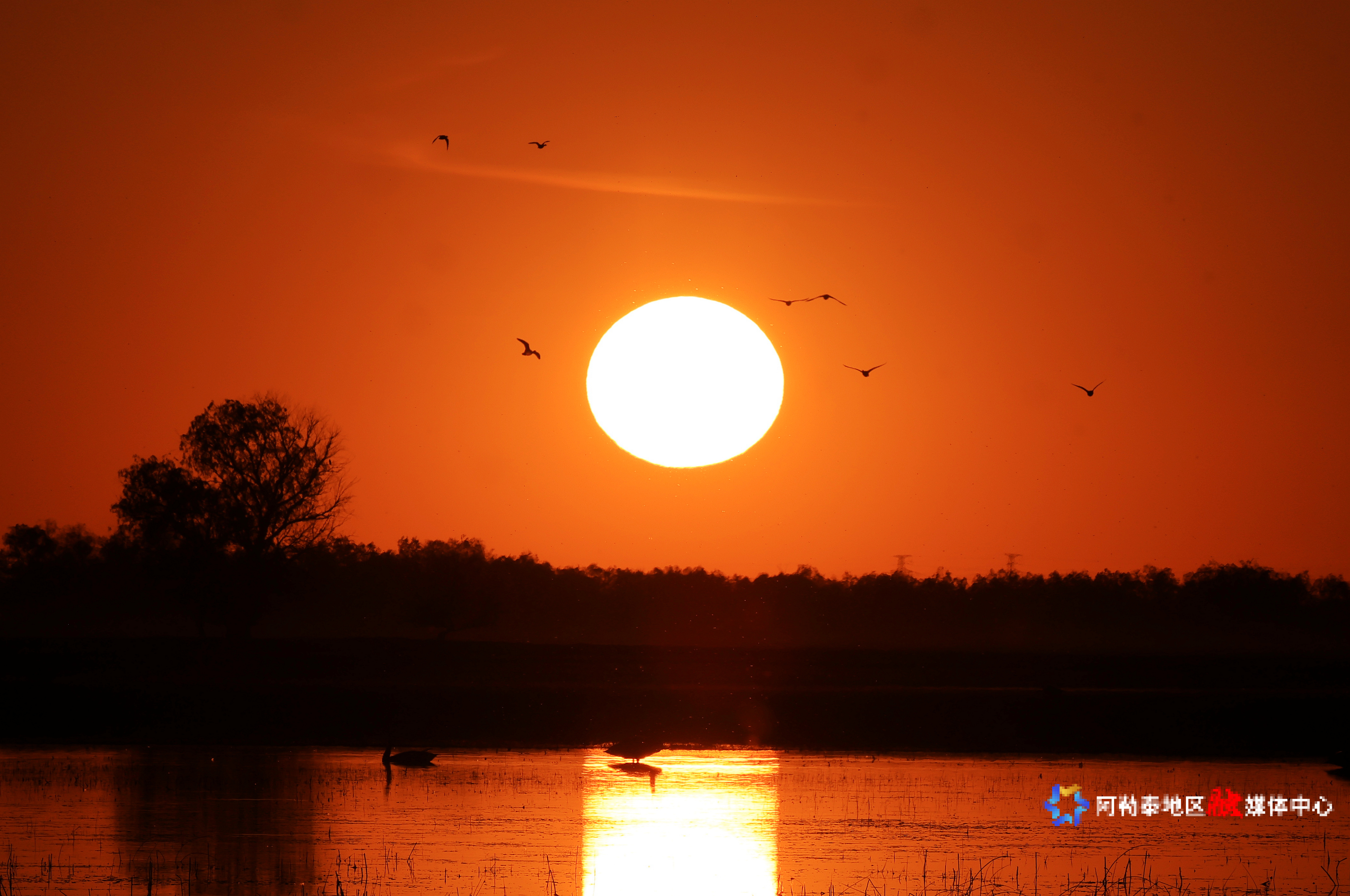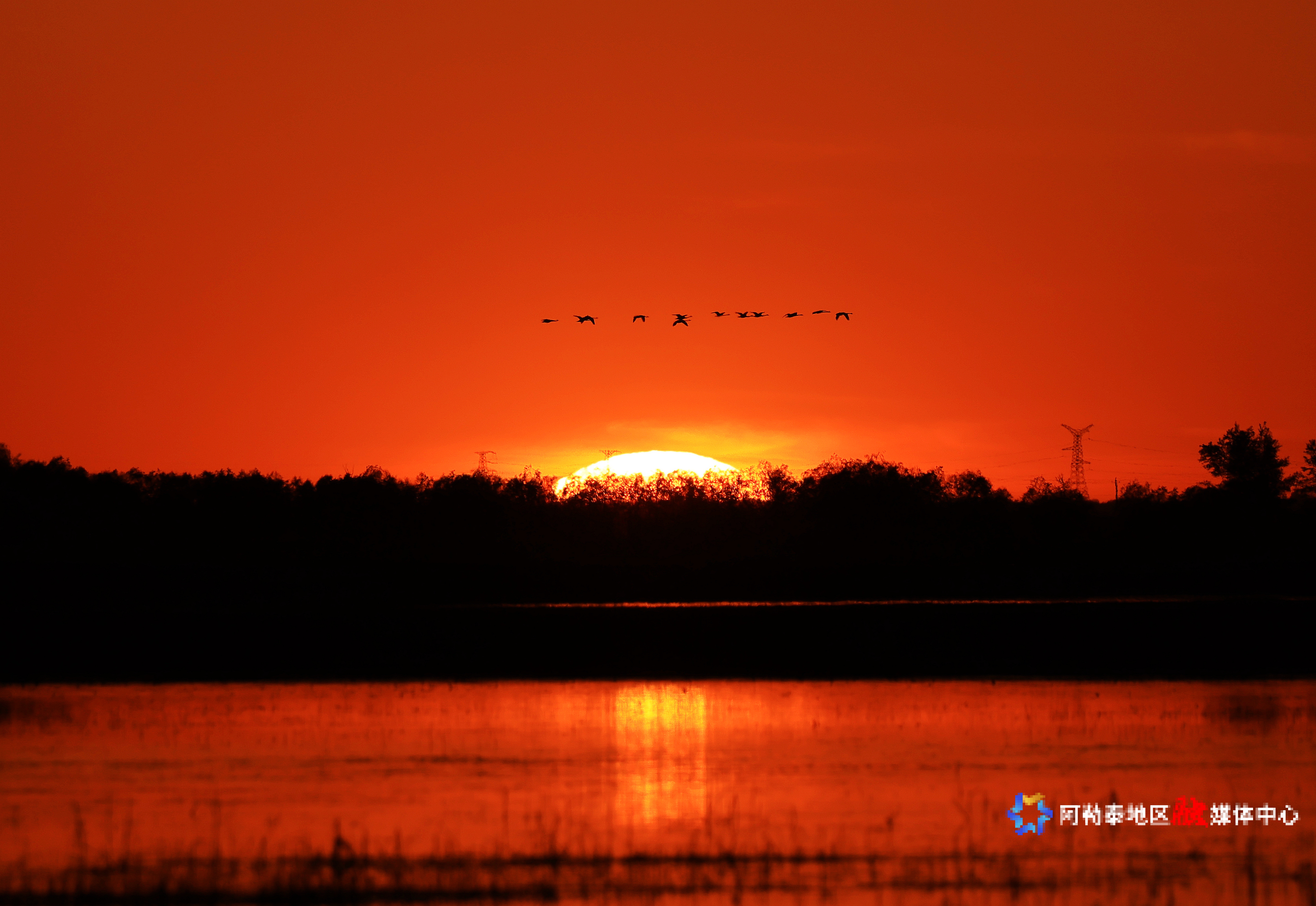 2025年5月8日晚霞,候鸟在阿勒泰科克苏湿地国家级自然保护区觅食,飞翔。记者 阿尔达克·拜斯汗 实习记者 塞力克·肯恩斯汗 摄