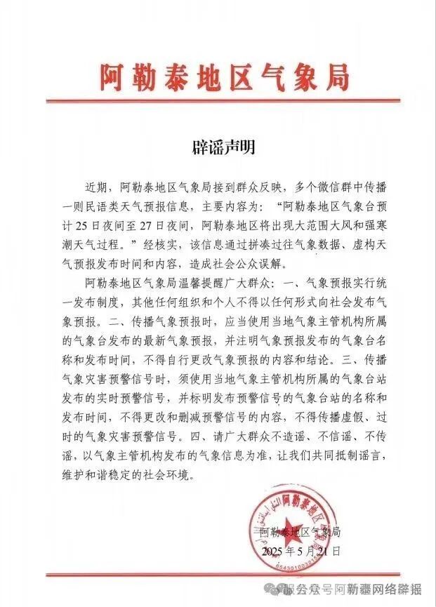 近期,有群众反映,多个微信群中传播一则民语类天气预报信息,称“阿勒泰地区气象台预计25日夜间至27日夜间,将出现大范围大风和强寒潮天气”。经气象部门核实,该信息系拼凑历史气象数据、虚构发布时间和预报内容,属不实信息。
