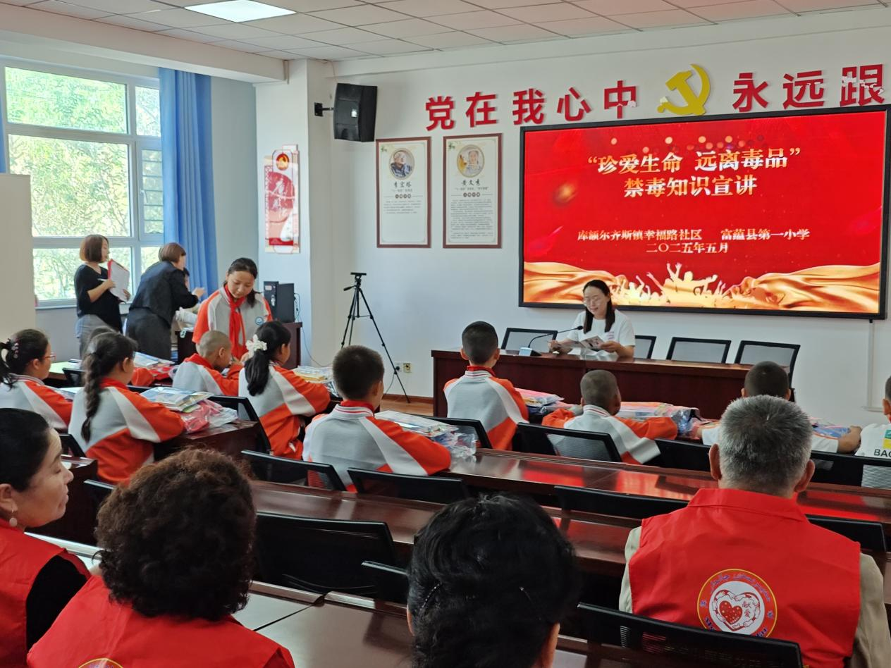 5月21日,富蕴县库额尔齐斯镇幸福路社区联合富蕴县第一小学开展以“珍爱生命 远离毒品”为主题的禁毒知识宣传活动。