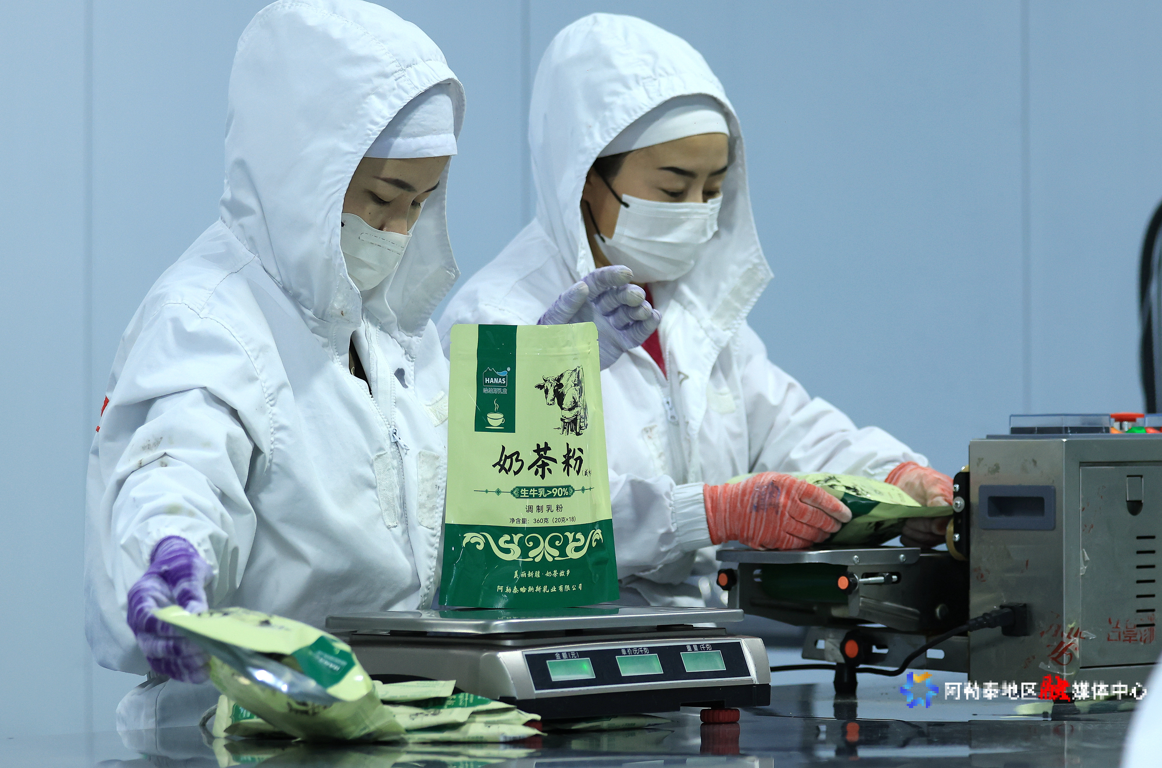 6月5日,走进阿勒泰哈纳斯乳业有限公司的生产车间,一片忙碌景象映入眼帘。只见机器飞速转动,加工完毕的咸奶茶粉在机器的操作下,被精准包装。这里的各项生产工作都在有条不紊推进着,工作人员“全副武装”,专注监测着生产流程,把生产线上传输过来的奶茶粉仔细分拣、装包。