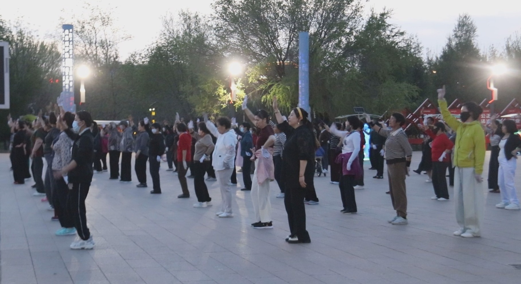 福海县委广场则洋溢着文艺气息,近百位居民跟随音乐节拍起舞,领舞者动作整齐有力,带动周围人群尽情舒展。一旁健身器材区,金属器械碰撞声与交谈声此起彼伏,交织成市井文化图景。福海镇居民韩晓丽说:“这边比较热闹,还有很多健身器材,可以锻炼一下身体,顺便跳一下广场舞,非常好。”