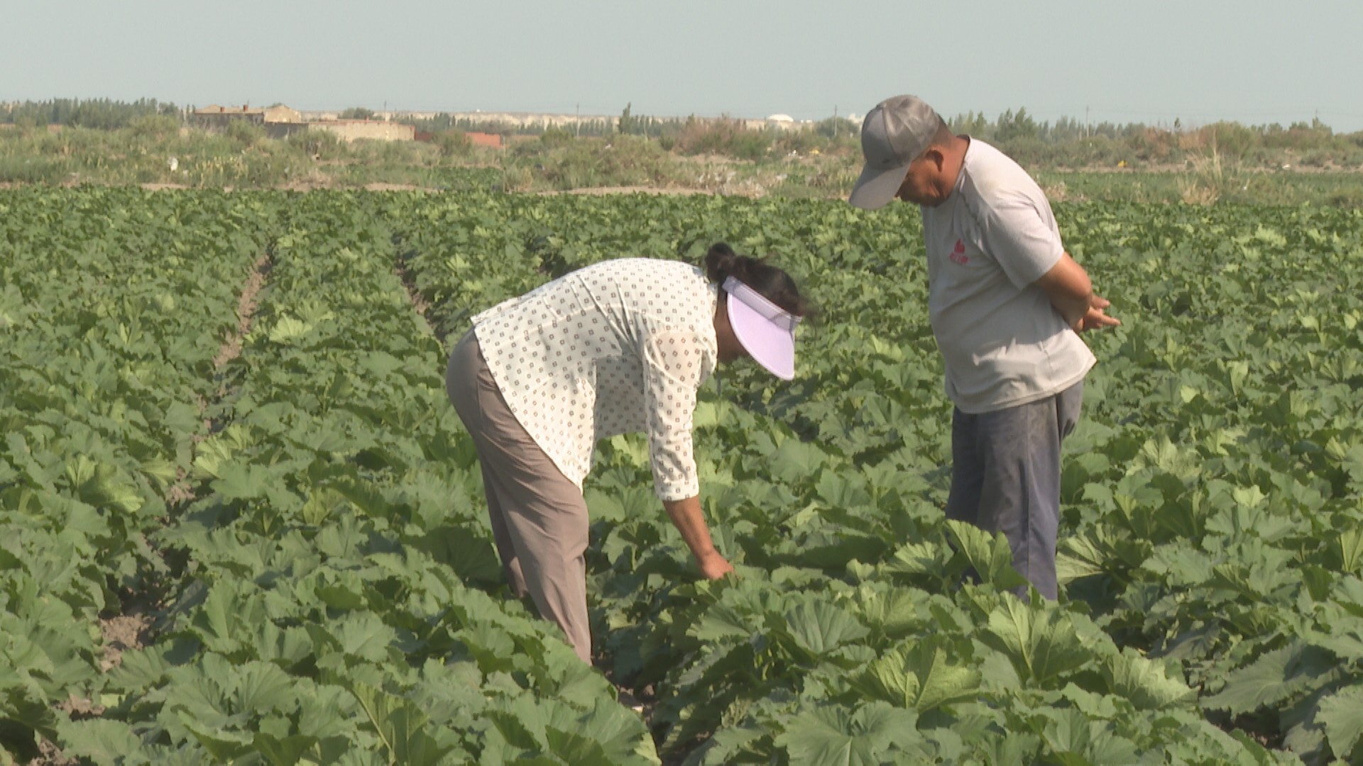 福海县解特阿热勒镇别斯朱勒德孜村葫芦瓜田里村民在查看瓜秧长势。