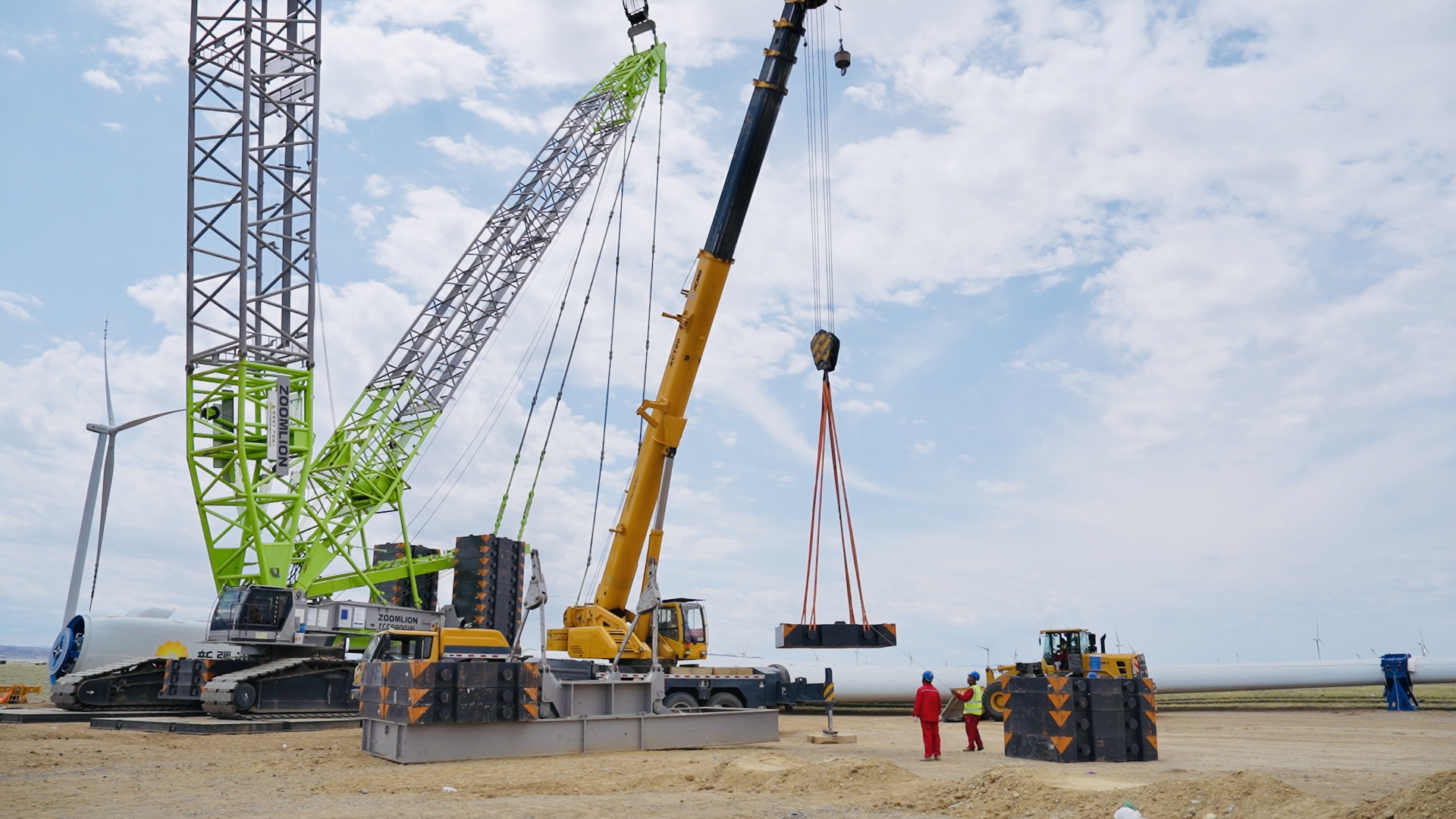 为确保首台设备顺利吊装,施工方组织开展吊装方案专家论证,对关键步骤进行反复推演,多次推演磨合主吊与辅吊的配合协同度,严格落实安全管控及技术交底要求,全力做好吊装前各项准备工作,确保工程顺利有序推进。在吊装过程中,施工人员遵循“精准操作、高效建造、安全第一”原则,采用激光定位仪,实时监测塔筒垂直度与方位,同时实时监测风速风向,保障吊装全过程管控。首台吊装的7.5兆瓦风机风轮直径204米,轮毂中心高度115米,轮机舱重量154吨,扫风面积相当于5个标准足球场,具有环境适应性,能够在中高风速陆上风场范围内稳定运行。