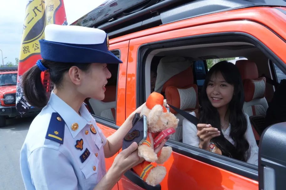 在通车仪式现场,消防宣传员向过往群众发放消防安全宣传读本及各类宣传物品,详细讲解火灾逃生自救技巧、高速公路上遇到火灾时应急处置方法以及灭火器的正确使用方法等内容。